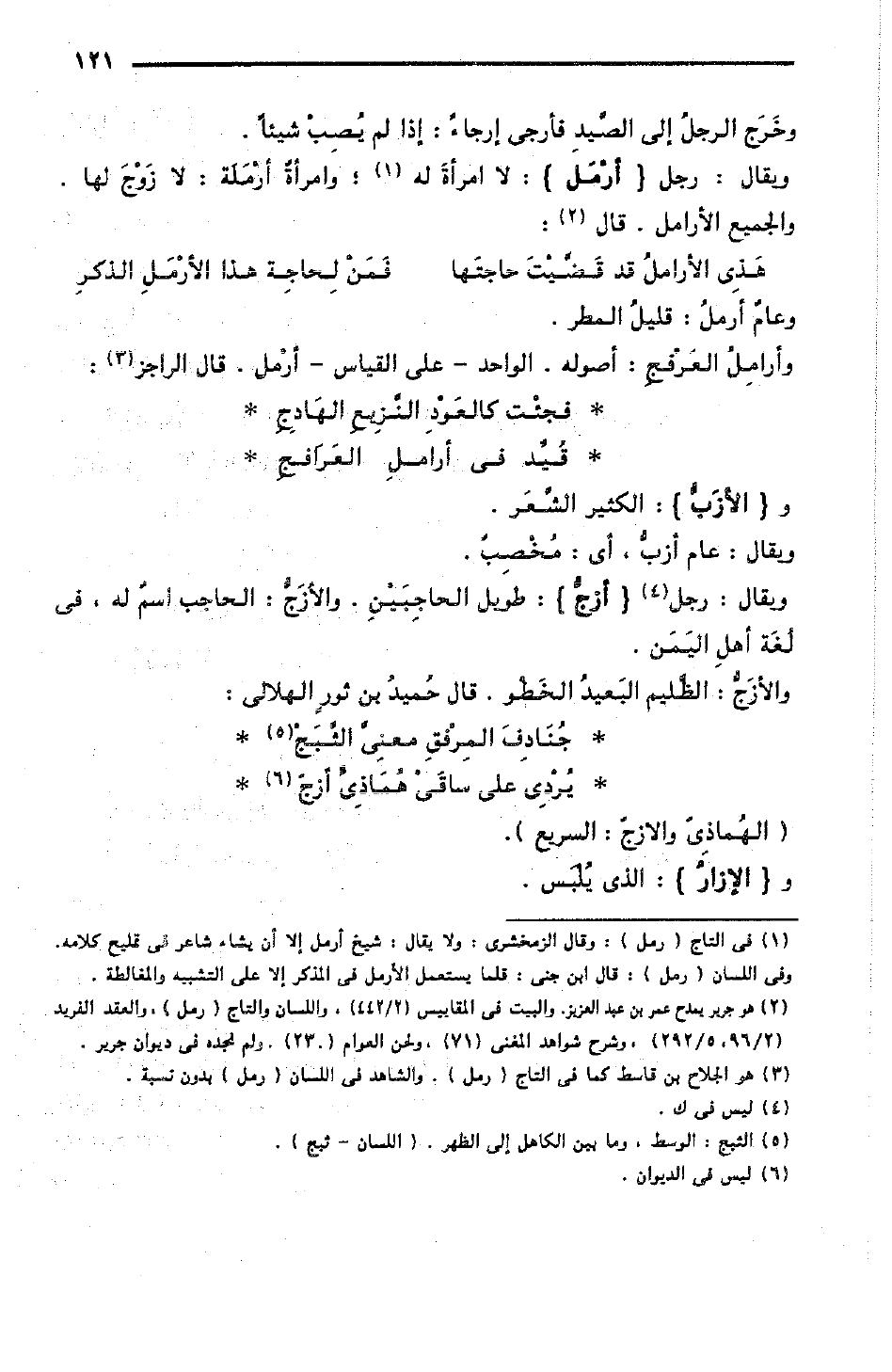ويقال: رَجُلٌ أَرْمَلٌ: لا امرأةَ له، وامرأةٌ أرْمَلَة: لا زَوْجَ لها، والجميعُ الأرامل، قال: [البسيط]