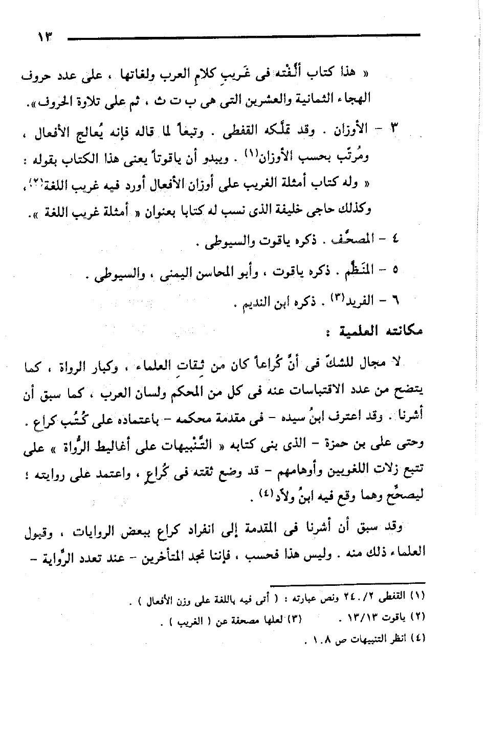 3 - الأوزان. وقد تملَّكه القفطي. وتبعاً لما قاله فإنه يُعالج الأفعال، ومُرتّب بحسب الأوزان (¬1). ويبدو أن ياقوتاً يعنى هذا الكتاب بقوله: "وله كتاب أمثلة الغريب على أوزان الأفعال أورد فيه غريب اللغة" (¬2)، وكذلك حاجي خليفة الذى نسب له كتابا بعنوان "أمثلة غريب اللغة".