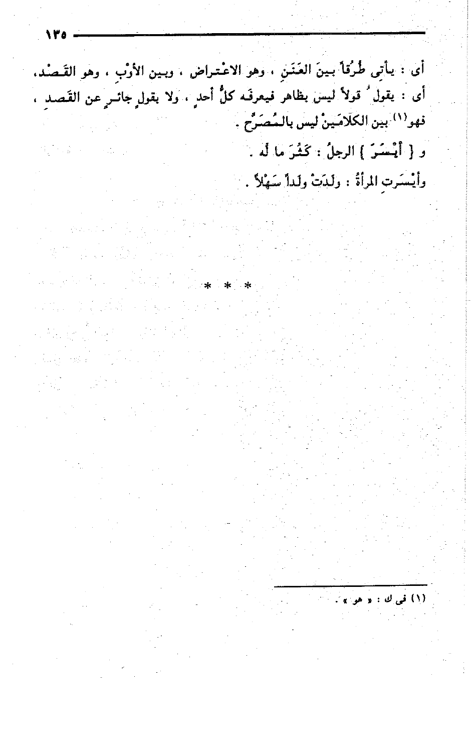 أي: يأتي طُرُقًا بينَ العَنَنِ، وهوالاعْتراضُ، وبَيْنَ الأَوْبِ، وهو القَصْدُ؛ أي: يقولُ قَوْلاً ليس بظاهرٍ فَيَعْرِفَه كُلُّ أحدٍ، ولا بقولٍ جائرٍ عن القَصدِ، فهو بين الكَلامَيْنِ، ليس بالمُصَرَّح.