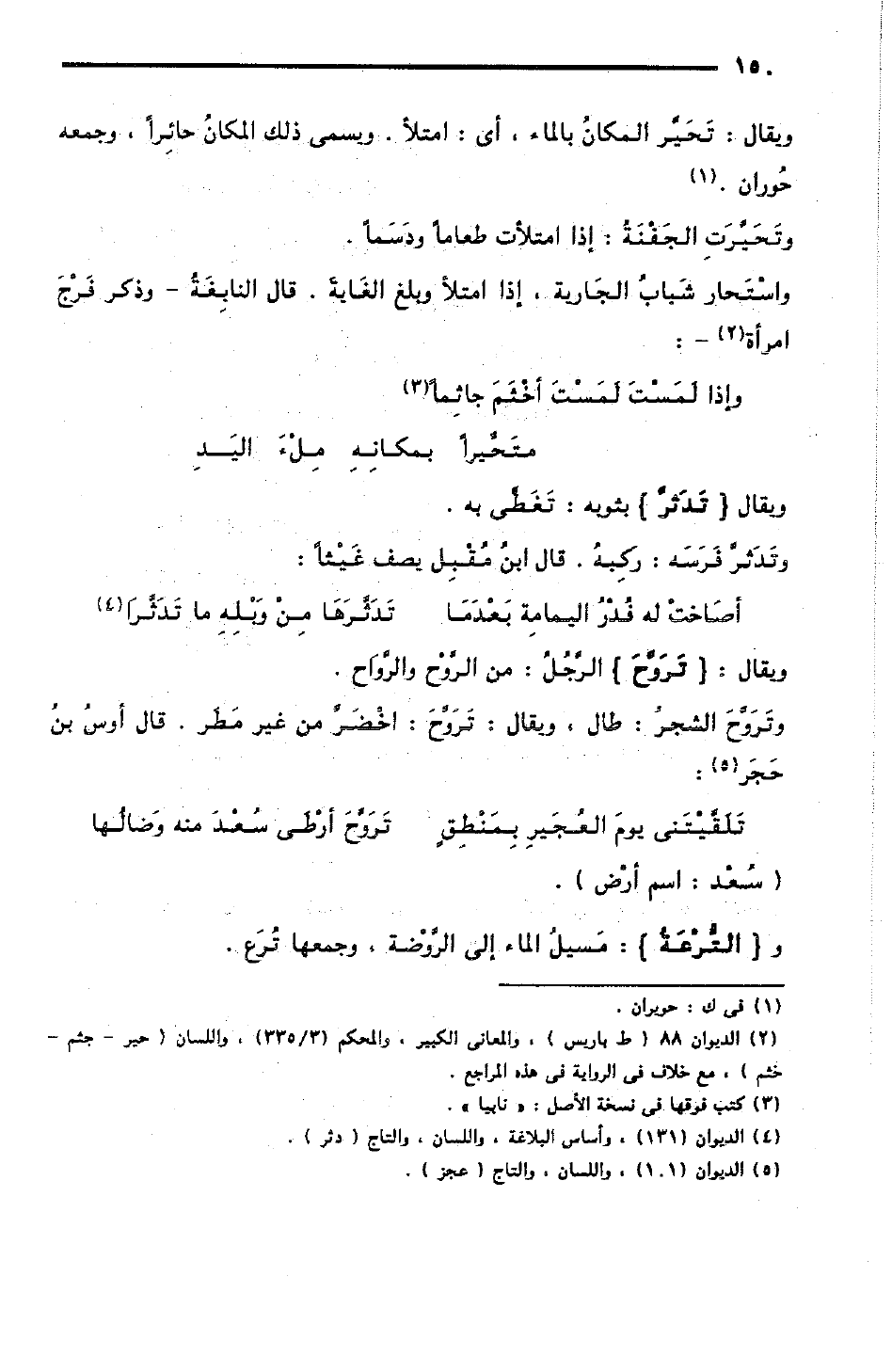 ويُقال: تَحَيَّر المكانُ بالماء، أي: امتلأ، ويسمى ذلك المكانُ حائِرًا، وجمعه حُوْرَانٌ.