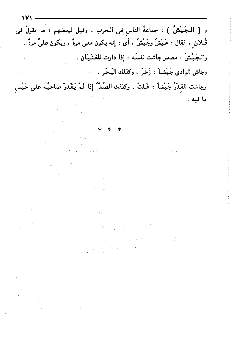والجَيْشُ: مصدر جاشت نفسه: إذا دارت للغَثَيَان.