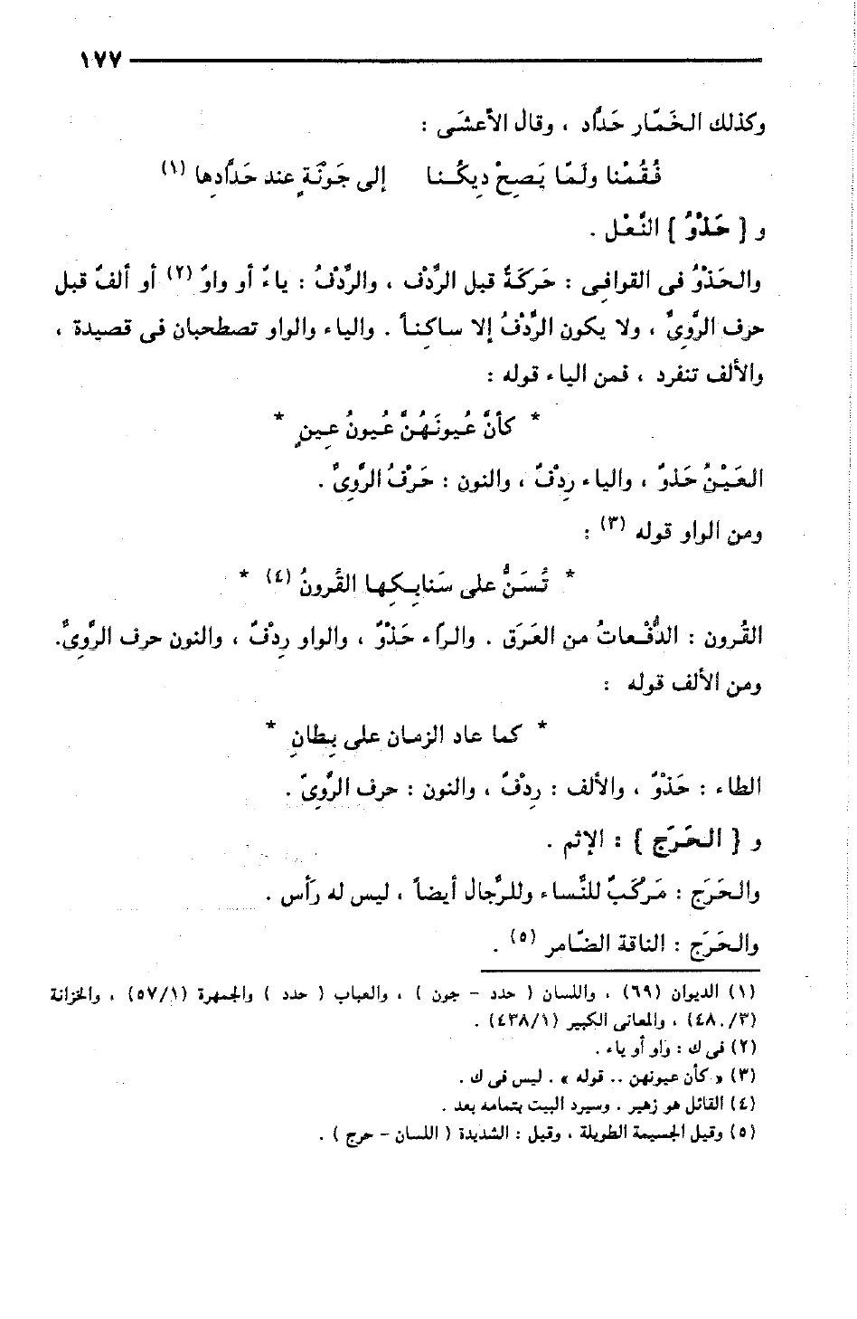 العَيْنُ حَذْوٌ، والياء رِدْفٌ، والنون: حَرْفُ الرَّوِيِّ. ومن الواو قوله [الوافر]: