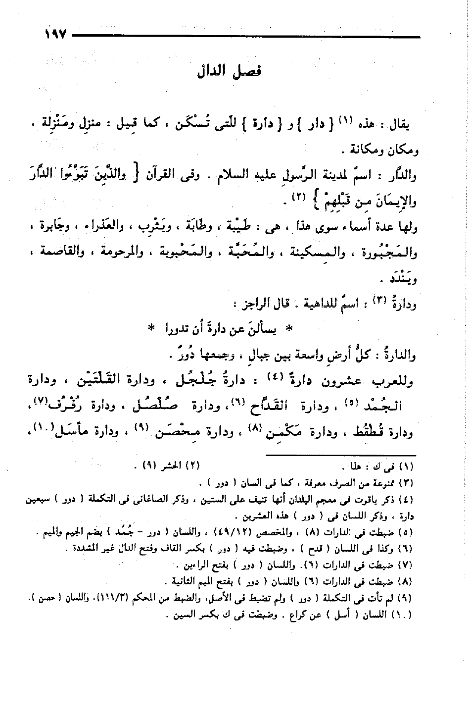 وللعرب عشرون دارة: دارة جُلْجُل، ودارة القَلْتَيْنِ، ودارة الجُمْد، ودارة القَدَّاح، ودارةُ صُلْصُل، ودارة رُفْرُف، ودارة قُطْقُط، ودارة مَكْمِن، ودارة مِحْصَن، ودارة مأسَل،
