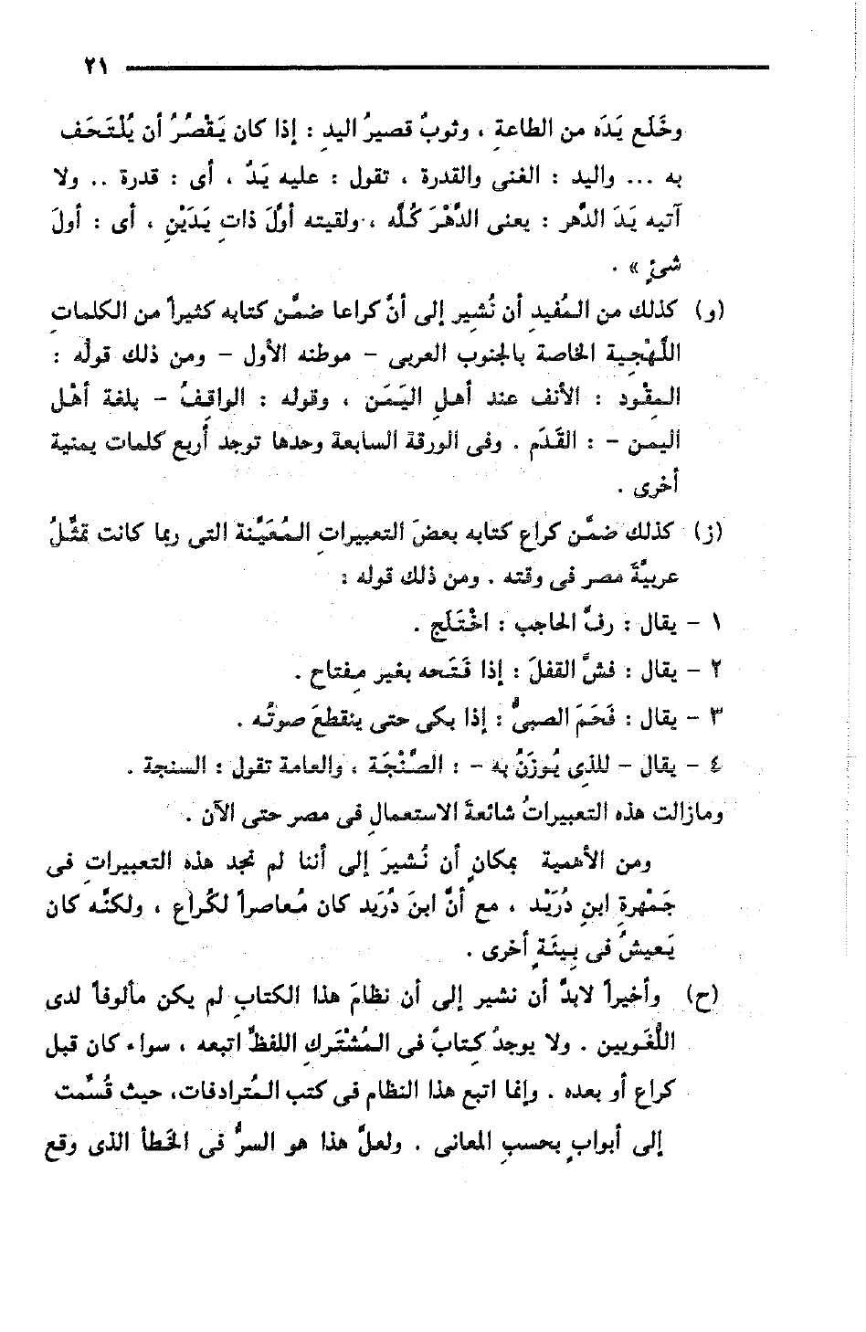 (ز) كذلك ضمَّن كراع كتابه بعضَ التعبيرات المُعَيَّنة التي ربما كانت تمثل عربية مصر في وقته. ومن ذلك قوله: