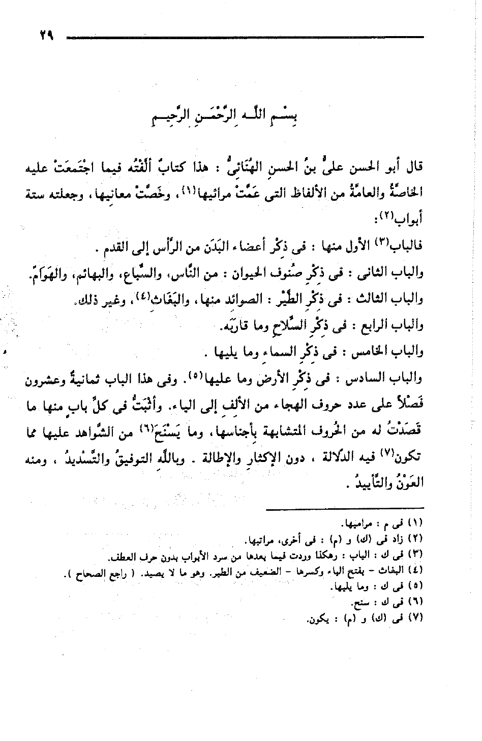 والباب السادس: في ذكر الأرض وما عليها. وفي هذا الباب ثمانية وعشرون فصلا على عدد حروف الهجاء من الألف إلي الياء. وأثبت في كل باب منها ما قصدت له من الحروف المتشابهة بأجناسها، وما يسنح من الشواهد عليها مما تكون فيه الدلالة، دون الإكثار والإطالة. وبالله التوفيق والتسديد، ومنه العون والتأييد