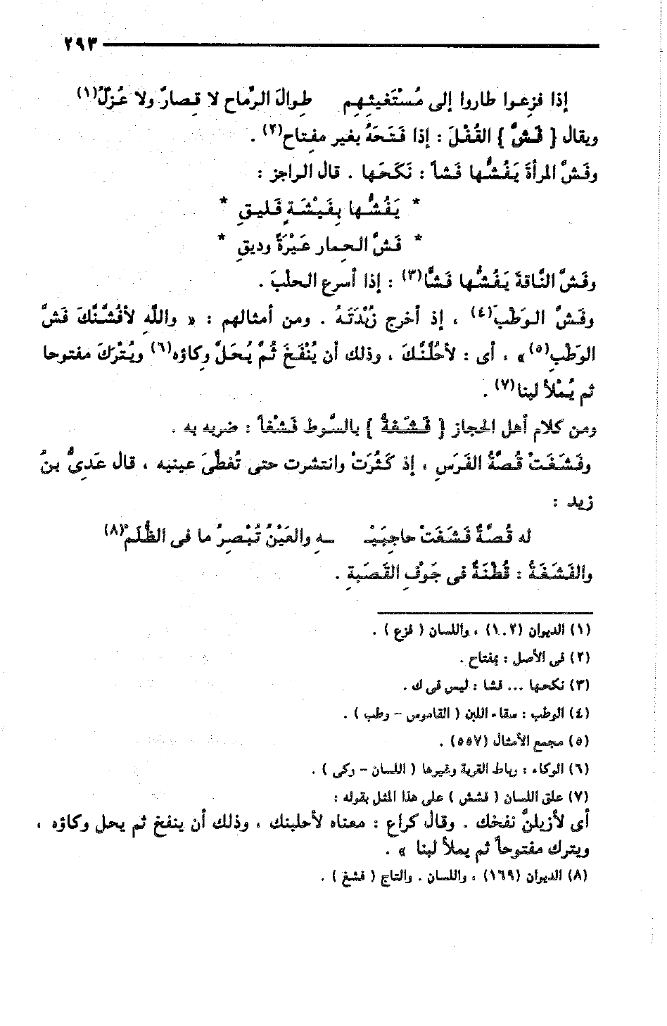 وفَشَّ الوَطْبَ، إذا أَخْرَجَ زُبْدَتَهُ، ومن أمثالهم: «والله لأَفُشَّنَّكَ فَشَّ الوَطْبِ»، أي: لأَحُلَّنَّكَ، وذلك أن يُنْفَخَ ثُمَّ يُحَلَّ وِكاؤه ويُتْرَكَ منفوخًا ثم يُمْلأَ لَبَنًا.