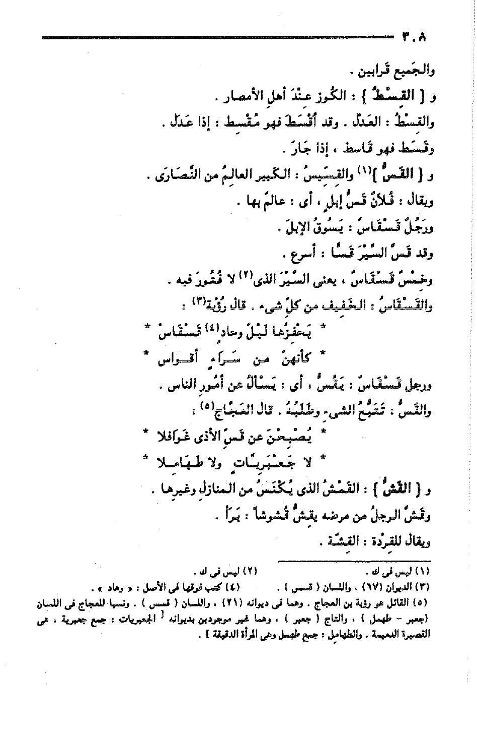 والقَسُّ: تَتَبُّعُ الشىءِ وطَلَبُهُ، قال العَجّاج: [الرجز]