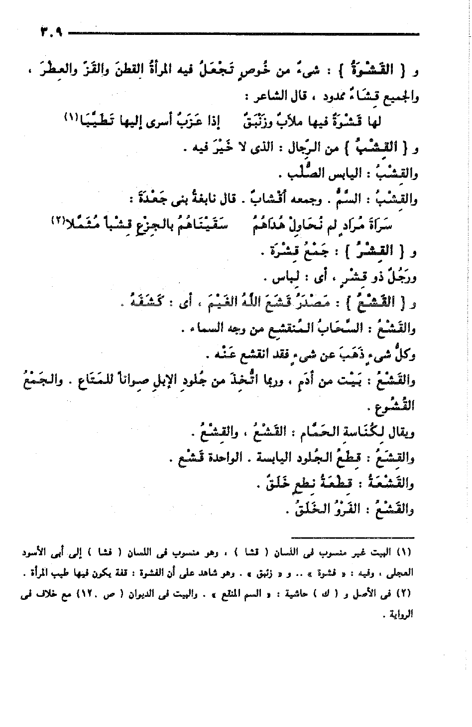 والقَشْوَةُ: شىءٌ من خُوصٍ تَجْعَلُ فيه المرأةُ القطنَ والقَزّ والعِطْرَ، والجميع قِشَاءٌ ممدود؛ قال الشاعر: [الطويل]