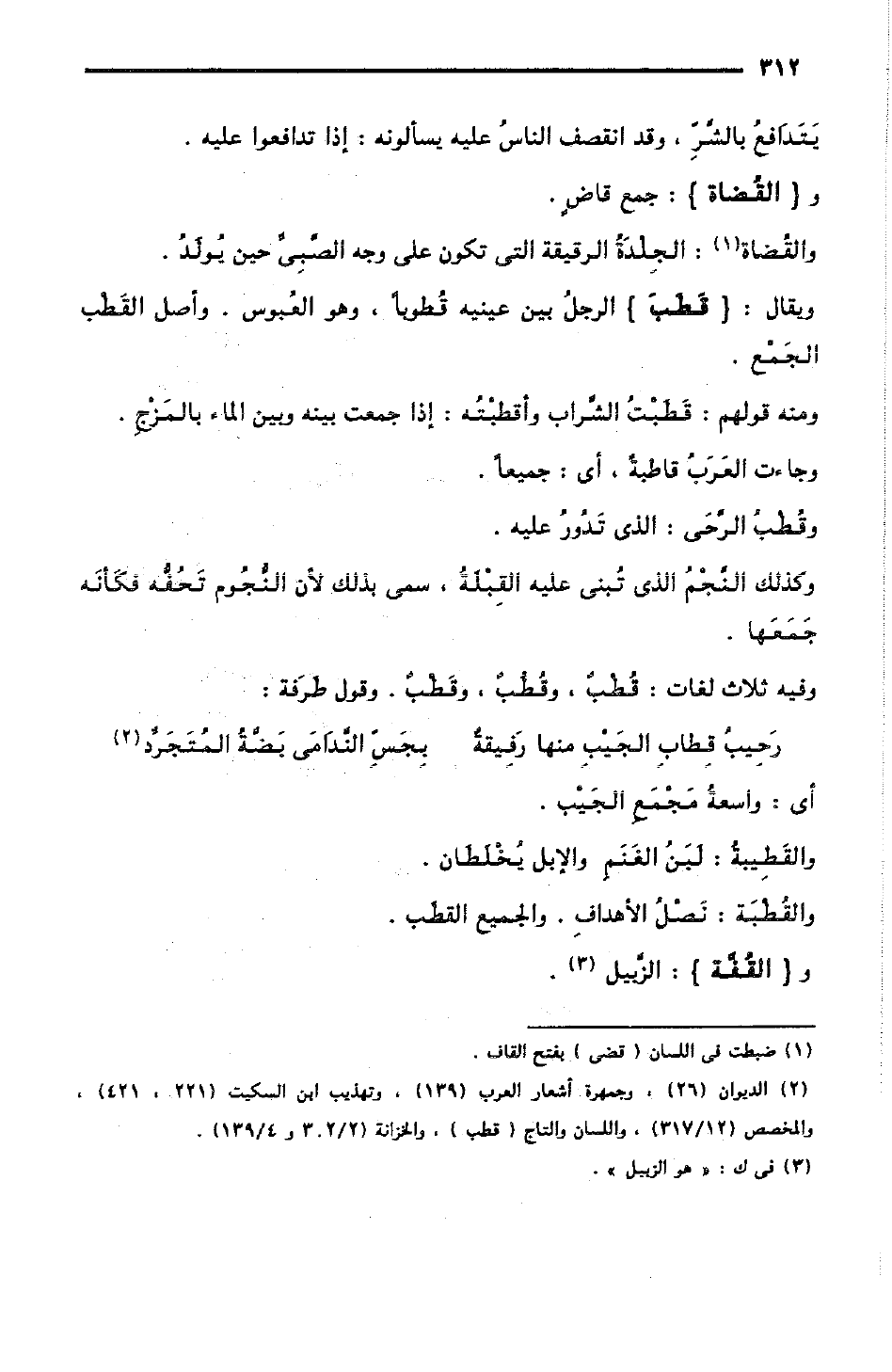 وفيه ثلاث لغات: قُطْبٌ، وقُطُبٌ، وقَطْبٌ.