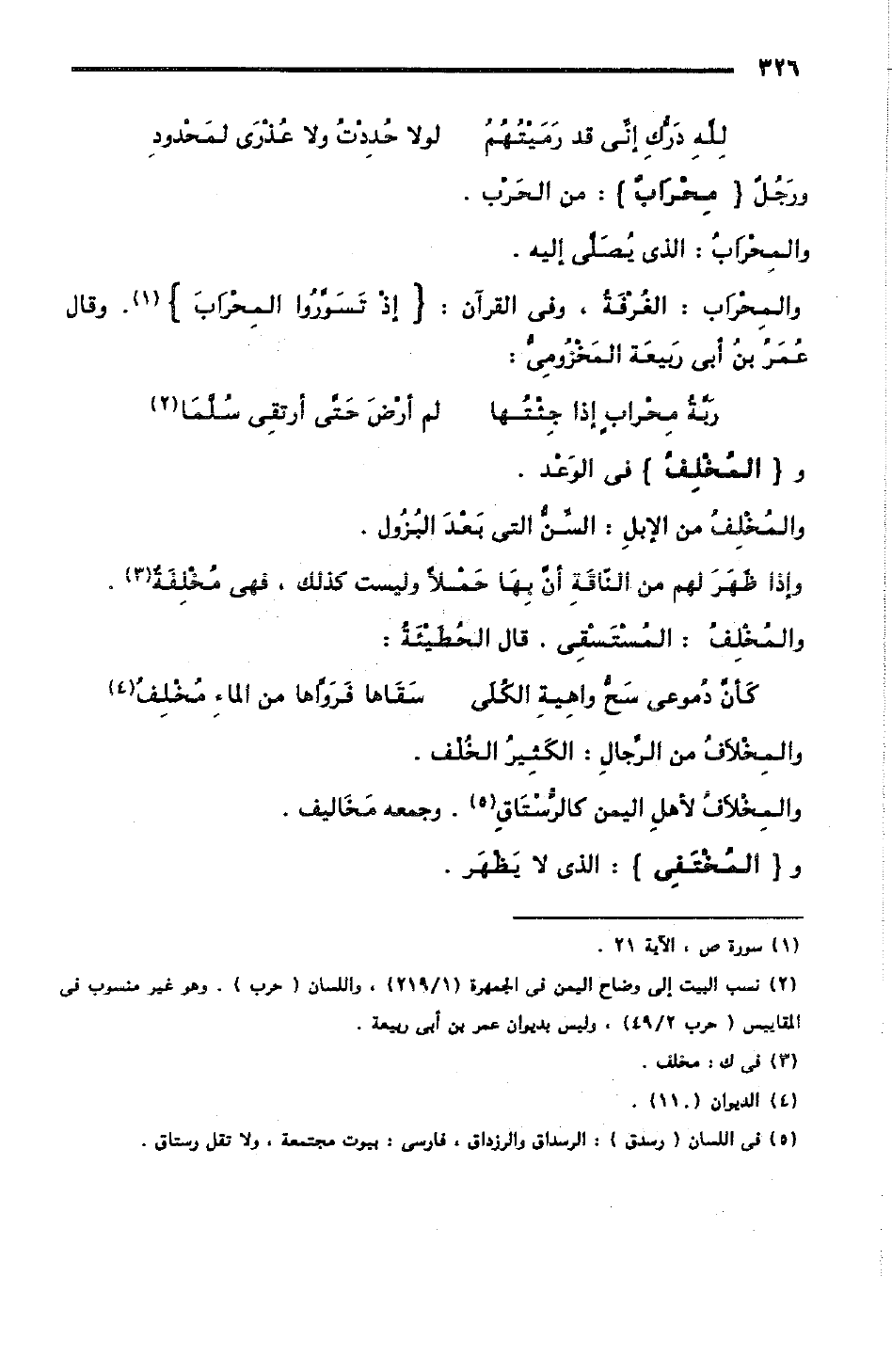 والمِحْرَابُ: الغُرْفَةُ، وفي القرآن: {إذْ تَسَوَّرُوا المِحْرَابَ} [سورة ص /12]؛ وقال عُمَرُ بنُ أبي رَبِيعَة المَخْزُومِيُّ: [السريع]