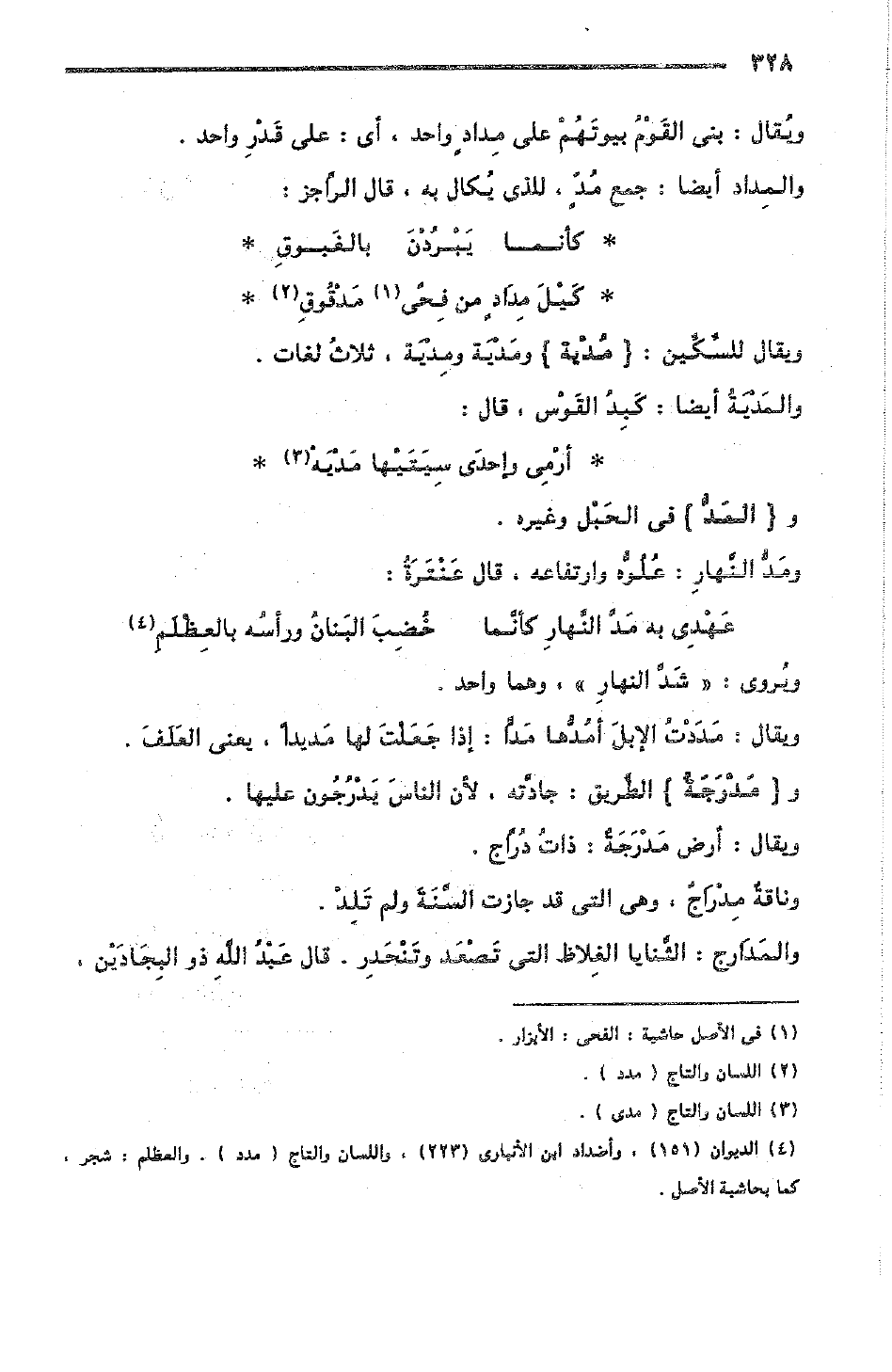 ويقال: مَدَدْت الإبلَ أمُدُّها مَدًّا: إذا جَعَلْتَ لها مَديدًا، يعني العَلَفَ.