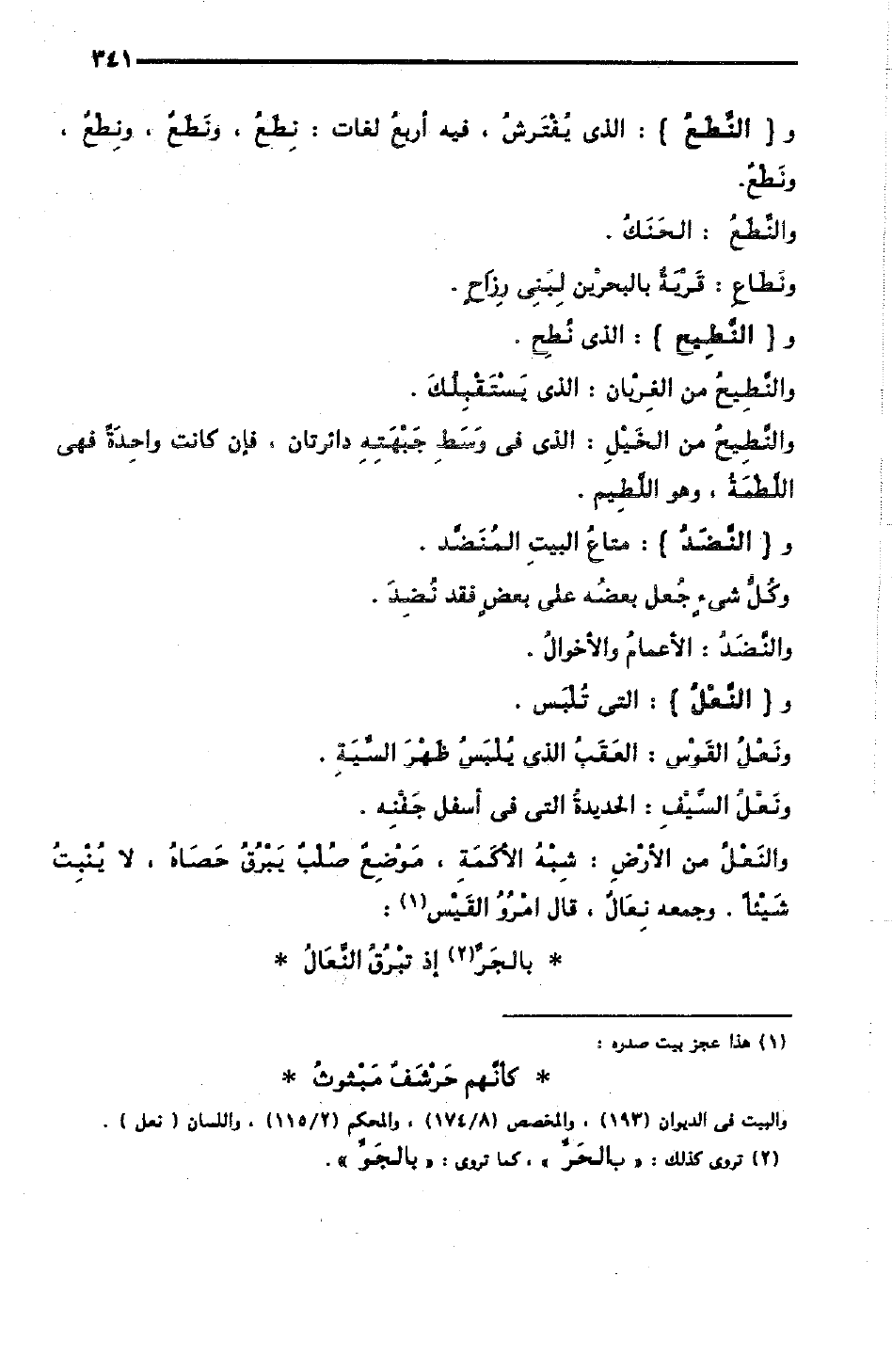 والنِّطَعُ: الذي يُفْتَرشُ، فيه أربعُ لغات: نِطَعٌ، ونَطَعٌ، ونِطْعٌ، ونَطْعٌ.