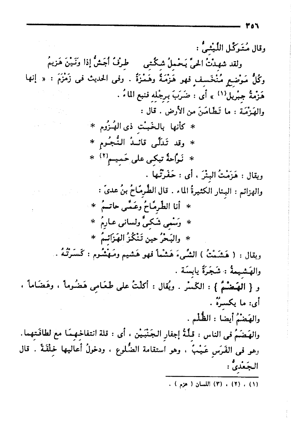 والهزائم: البِئار الكثيرُ الماء، قال الطِّرِمَّاحُ بنُ عديّ: [الرجز]