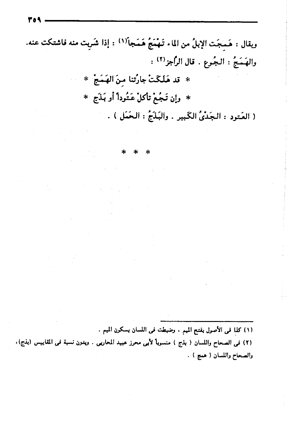 قد هَلَكَتْ جارتُنا مِنَ الهَمَجْ ... وإن تَجُعْ تأكلْ عَتُودًا أو بَذَجْ