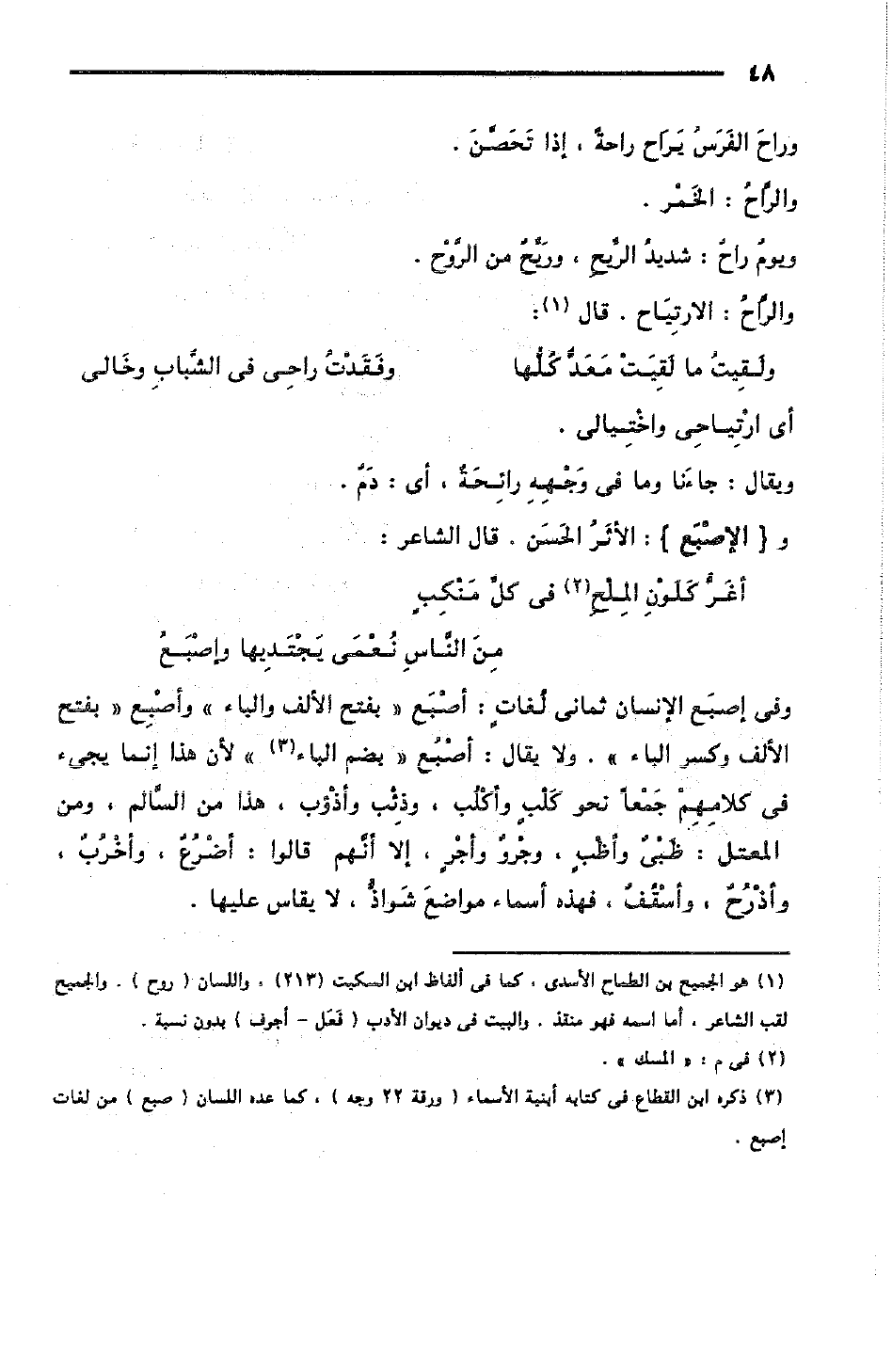 وفي إصبَع الإنسان ثماني لُغاتٍ: أَصْبَع بفتح الألف والباء، وأَصْبِع بفتح الألف وكسر الباء، ولا يقال: أَصْبُع بضم الباء، لأن هذا إنما يَجِىْءُ في كلامِهِمْ جَمْعًا، نحو كَلْبٍ وأكْلُب، وذِئْب وأذْؤب، هذا من السَّالم، ومن المعتل: ظَبْيٌ وأظْبٍ، وجِرْوٌ وأجْرٍ؛ إلا أنّهم قالوا: أضْرُعٌ، وأخْرُبٌ، وأذْرُحٌ، وأسْقُفٌ، فهذه أسماءُ مواضعَ شَواذُّ، لا يقاس عليها.