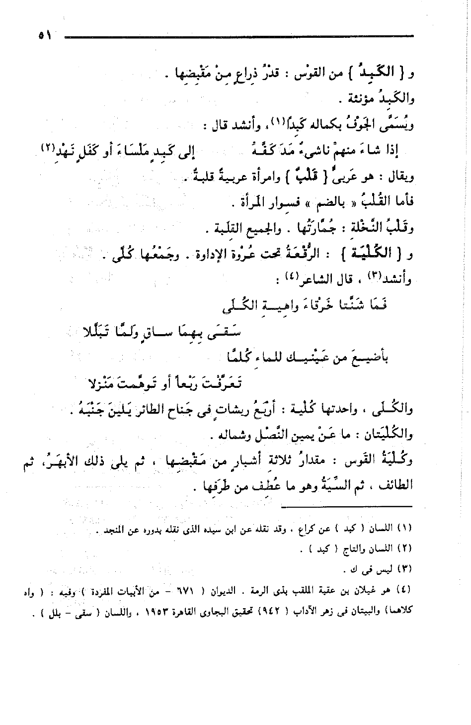 وكُلْيَة القَوس: مقدارُ ثلاثةِ أشبارٍ من مَقْبِضِها، ثم يلي ذلك الأبْهَرُ، ثم الطائف، ثم السِّيَةُ وهو ما عُطِف من طرفها.