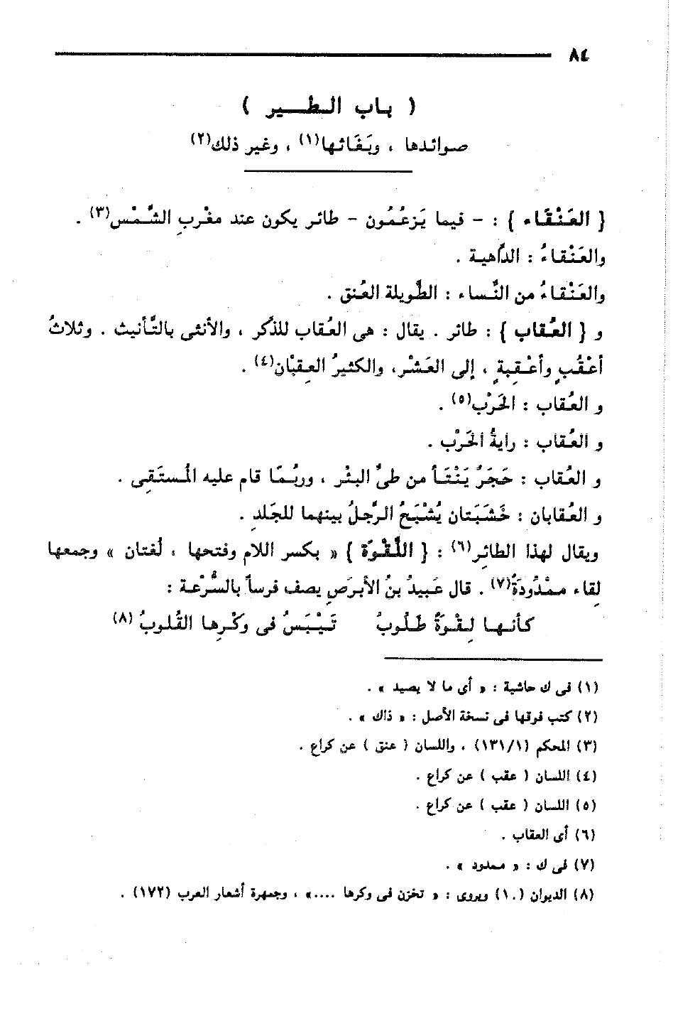 ويقال لهذا الطائِر: اللِّقْوَة بكسر اللام وفتحها، لُغتان، وجمعها لِقاء - ممْدودَةٌ؛ قال عَبيدُ بنُ الأبرَصِ يصف فرسًا بالسُّرْعة: [مخلع البسيط]