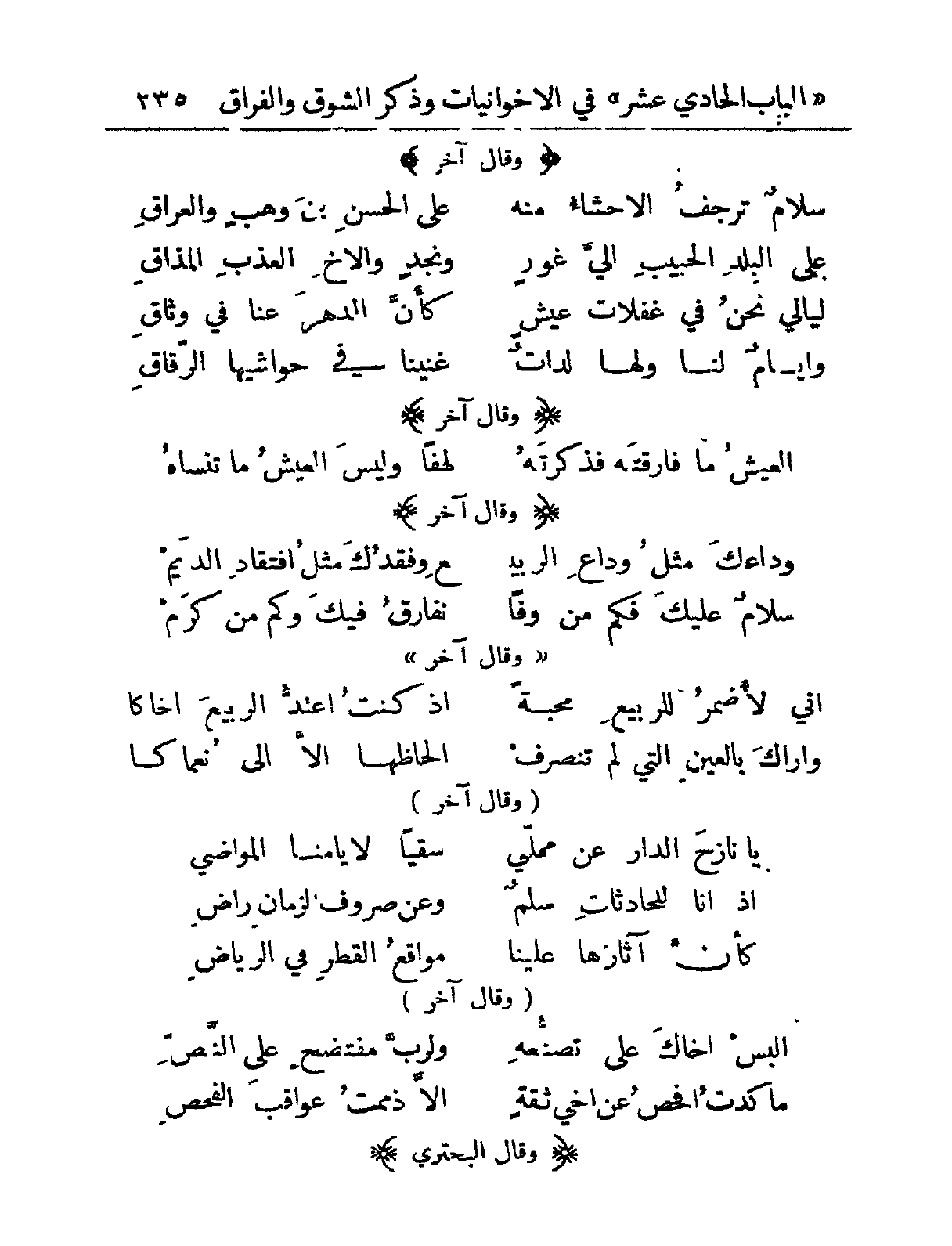 سلامٌ ترجفُ الأحشاءُ منهُ ... على الحسنِ بنَ وهب والعراقِ