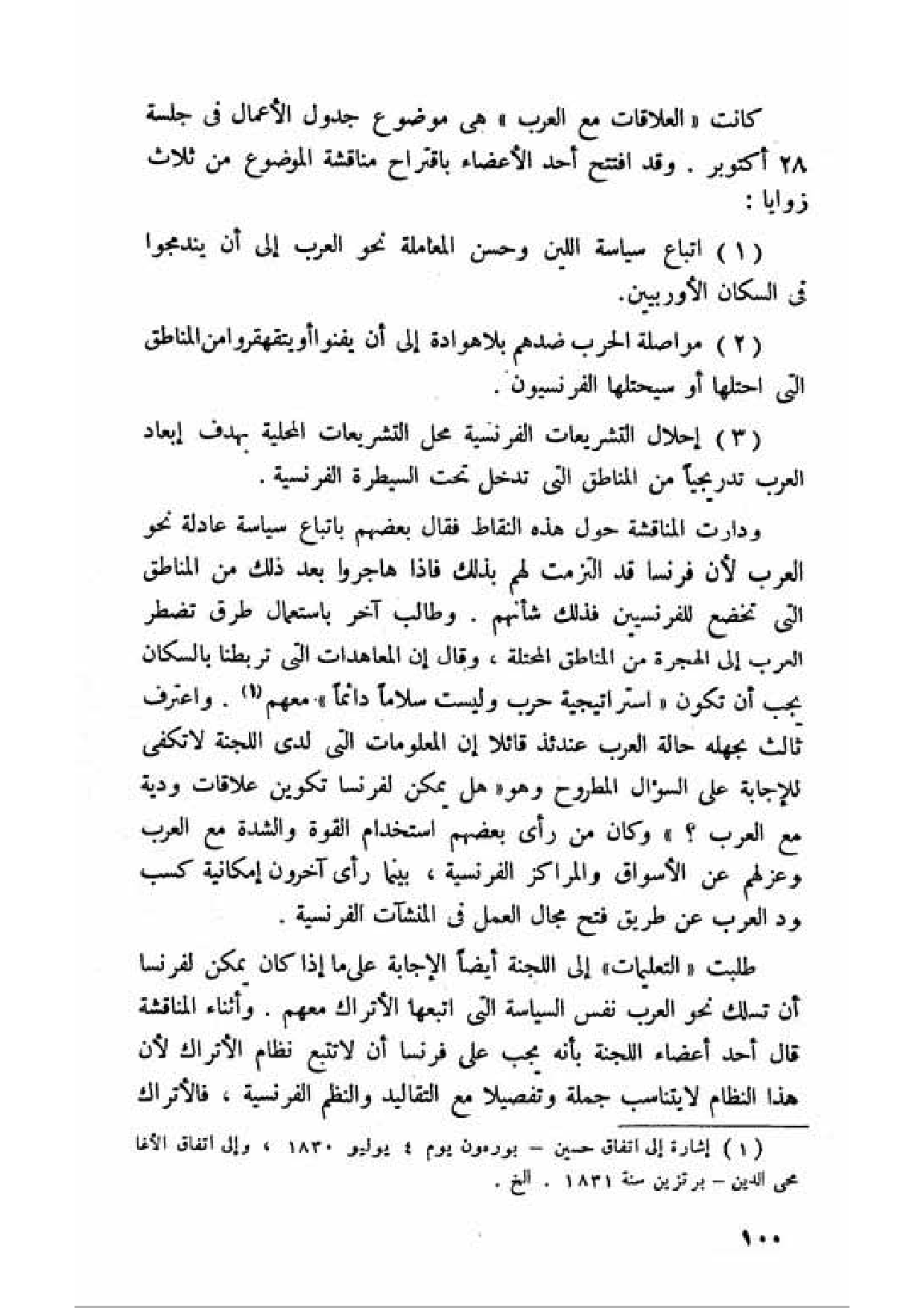 ودارت المناقشة حول هذه النقاط فقال بعضهم باتباع سياسة عادلة نحو العرب لأن فرنسا قد التزمت لهم بذلك فاذا هاجروا بعد ذلك من المناطق التي تخضع للفرنسيين فذلك شأنهم. وطالب آخر باستعمال طرق تضطر العرب إلى الهجرة من المناطق المحتلة، وقال إن المعامدات التي تربطنا بالسكان يجب أن تكون (استراتيجية حرب وليست سلاما دائما) معهم (¬1). واعترف ثالث بجهله حالة العرب عندئذ قائلا إن المعلومات التي لدى اللجنة لا تكفي للإجابة على السؤال المطروح وهو (هل يمكن لفرنسا تكوين علاقات ودية مع العرب؟) وكان من رأي بعضهم استخدام القوة والشدة مع العرب وعزلهم عن الأسواق والمراكز الفرنسة، بينما رأى آخرون إمكانية كسب ود العرب عن طريق فتح مجال العمل في المنشآت الفرنسية.