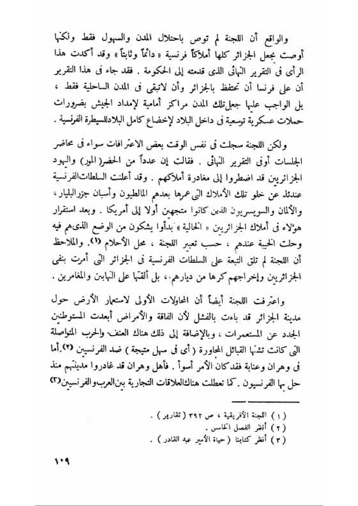 واعترفت اللجنة أيضا أن المحاولات الأولى لاستعمار الأرض حول مدينة الجزائر قد باءت بالفشل لأن الفاقة والأمراض أبعدت المستوطنين الجدد عن المستعمرات، وبالإضافة إلى ذلك هناك العنف والحرب المتواصلة التي كانت تشنها القبائل المجاورة (أي في سهل متيجة) ضد الفرنسيين (¬2). أما في وهران وعنابة فقدكان الأمر أسوأ. فأهل وهران قد غادروا مدينتهم منذ حل بها الفرنسيون. كما تعطلت هناك العلاقات التجارية بين العرب والفرنسيين (¬3).