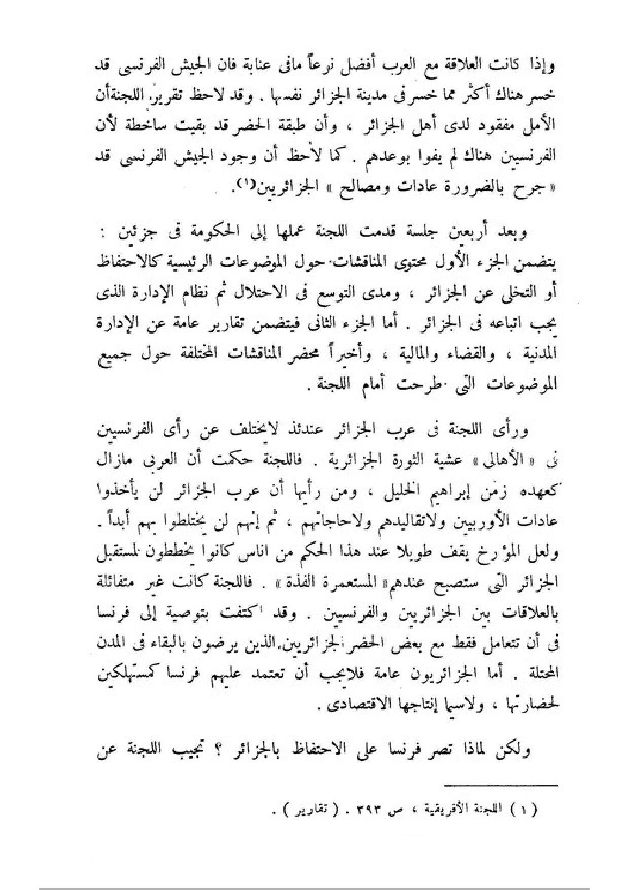 ورأي اللجنة في عرب الجزائر عندئذ لا يختلف عن رأي الفرنسيين في (الأهالي) عشية الثورة الجزائرية. فاللجنة حكمت أن العربي ما زال كعهده زمن ابراهيم الخليل، ومن رأيها أن عرب الجزائر لن يأخذوا عادات الأوربيين ولا تقاليدهم ولا حاجاتهم، ثم إنهم لن يختلطوا بهم أبدا.