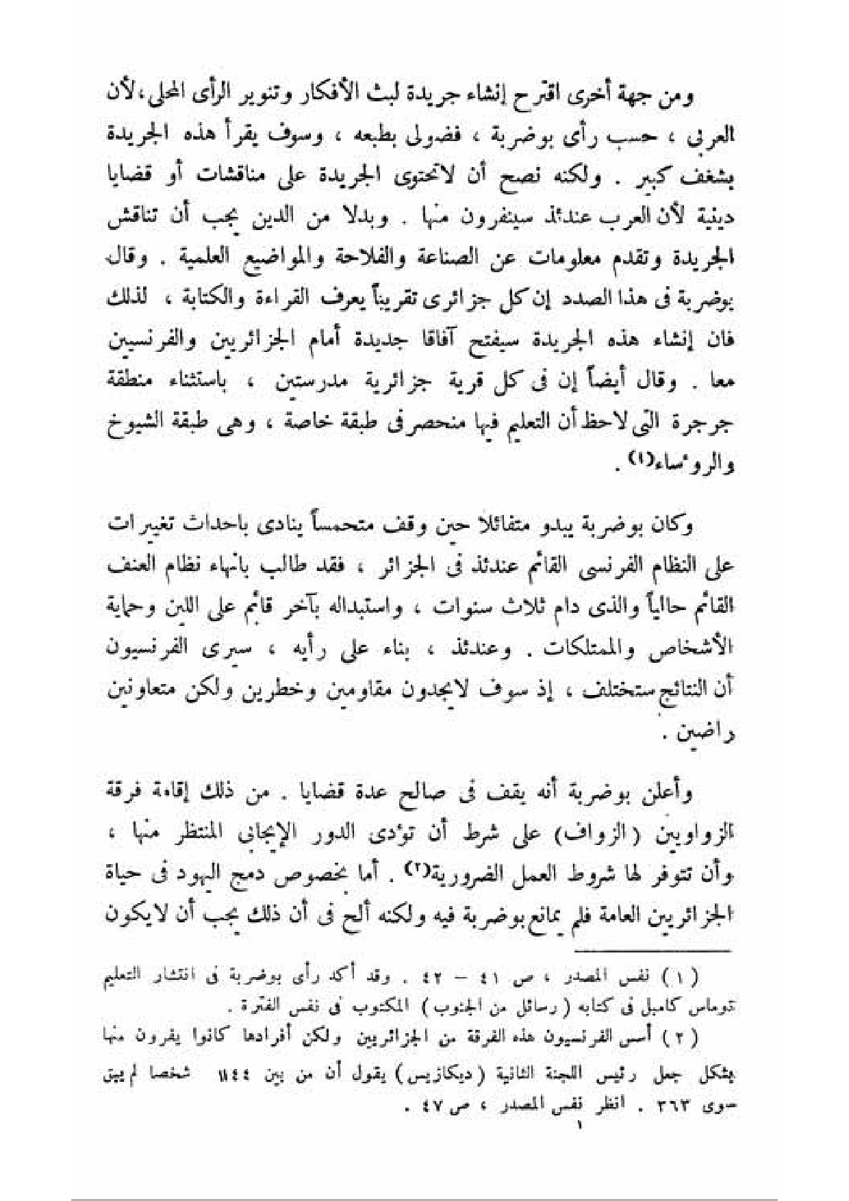 وأعلن بوضربة أنه يقف في صالح عدة قضايا. من ذلك إقامة فرقة الزواويين (الزواف) على شرط أن تؤدي الدور الإيجابي المنتظر منها، وأن تتوفر لها شروط العمل الضرورية (¬2). أما بخصوص دمج اليهود في حياة الجزائريين العامة فلم يمانع بوضربة فيه ولكنه ألح في أن ذلك يجب أن لا يكون