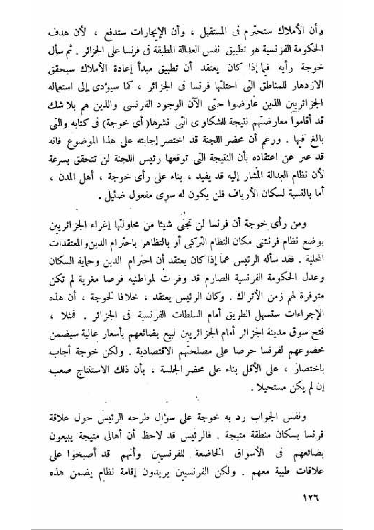 وأن الأملاك ستحترم في المستقبل، وأن الإيجارات ستدفع، لأن هدف الحكومة الفرنسية هو تطبيق نفس العدالة المطبقة في فرنسا على الجزائر. ثم سأل خوجة رأيه فيما إذا كان يعتقد أن تطبيق مبدأ إعادة الأملاك سيحقق الازدهار للمناطق التي احتلتها فرنسا في الجزائر، كما سيؤدي إلى استعماله الجزائريين الذين عارضوا حتى الآن الوجود الفرنسي والذين هم بلا شك قد أقاموا معارضتهم نتيجة للشكاوى التي نشرها (أي خوجة) في كتابه والتي بالغ فيها. ورغم أن محضر اللجنة قد اختصر إجابته على هذا الموضوع فإنه قد عبر عن اعتقاده بأن النتيجة التي توقعها رئيس اللجنة لن تتحقق بسرعة لأن نظام العدالة المشار إليه قد يفيد، بناء على رأي خوجة، أهل المدن، أما بالنسبة لسكان الأرياف فلن يكون له سوى مفعول ضئيل.