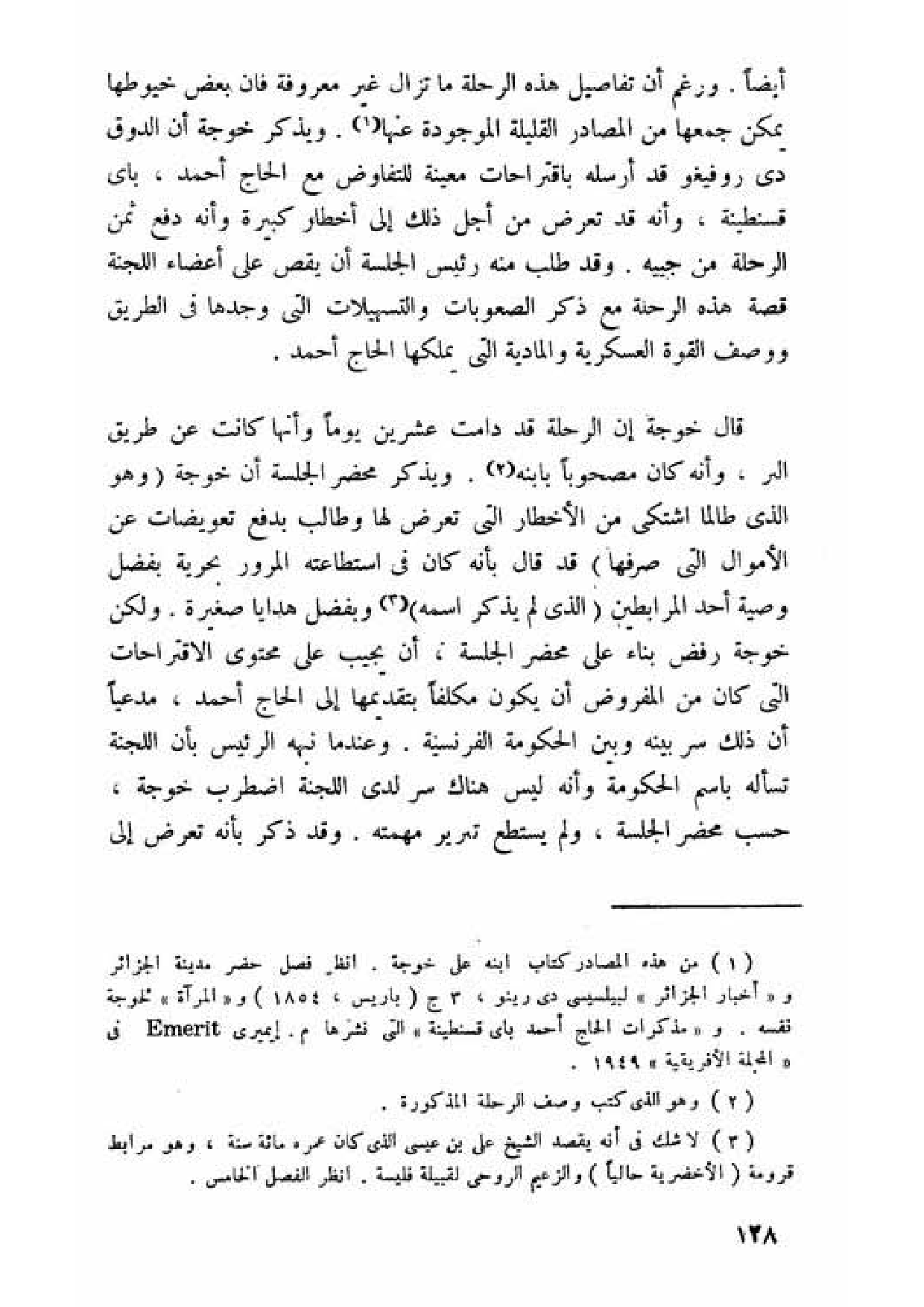 أيضا. ورغم أن تفاصيل هذه الرحلة ما تزال غير معروفة فان بعض خيوطها يمكن جمعها من المصادر القليلة الموجودة عنها (¬1). ويذكر خوجة أن الدوق دي روفيغو قد أرسله باقتراحات معينة للتفاوض مع الحاج أحمد، باي قسنطينة، وأنه قد تعرض من أجل ذلك إلى أخطار كبيرة وأنه دفع ثمن الرحلة من جيبه. وقد طلب منه رئيس الجلسة أن يقص على أعضاء اللجنة قصة هذه الرحلة مع ذكر الصعوبات والتسهيلات التي وجدها في الطريق ووصف القوة العسكرية والمادية التي يملكها الحاج أحمد.
