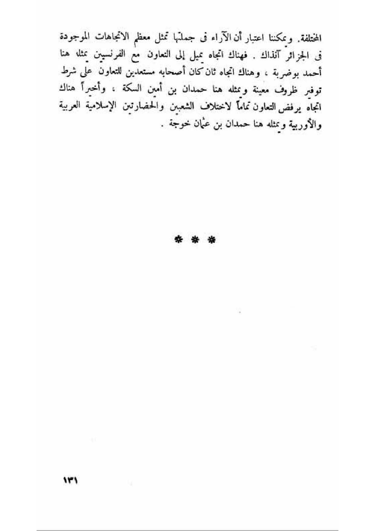 المختلفة. ويمكننا اعتبار أن الآراء في جملتها تمثل معظم الاتجاهات الموجودة في الجزائر آنذاك. فهناك اتجاه يميل إلى التعاون مع الفرنسيين يمثله هنا أحمد بوضربة، وهناك اتجاه ثان كان أصحابه مستعدين للتعاون على شرط توفير ظروف معينة ويمثله هنا حمدان بن أمين السكة، وأخيرا هناك اتجاه يرفض التعاون تماما لاختلاف الشعبين والحضارتين الإسلامية العربية والأوربية ويمثله هنا حمدان بن عثمان خوجة.