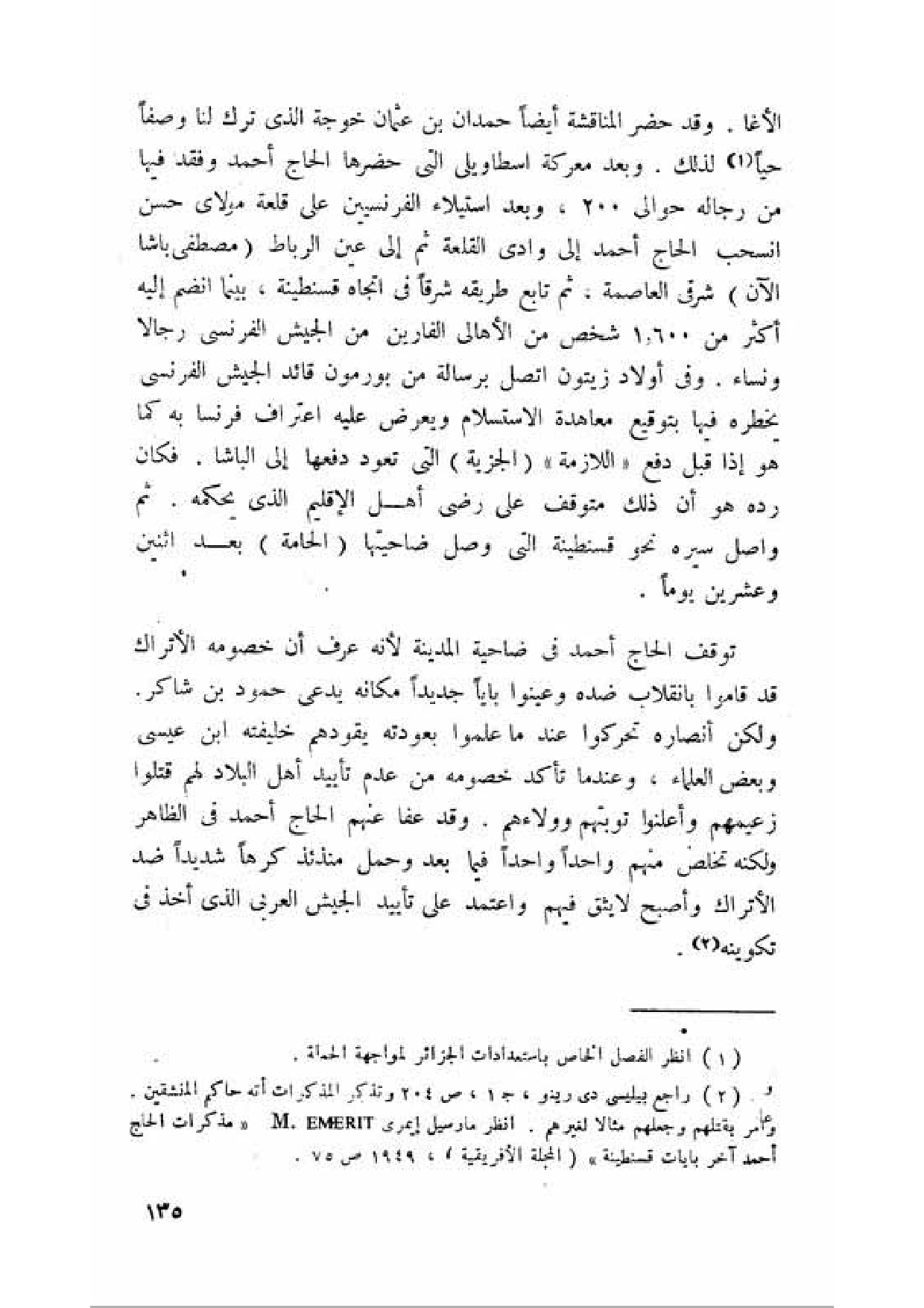 (¬2) راجع بيليبي دي رينو، ج1، ص 204 وتذكر المذكرات أنه حاكم المنشقين وأمر بقتلهم وجعلهم مثالا لغيرهم. انظر مارسيل إيميري M. EMERIT .(مذكرات الحاج أحمد آخر بايات قسنطينة) (المجلة الأفريقية)، 1949 ص 75.