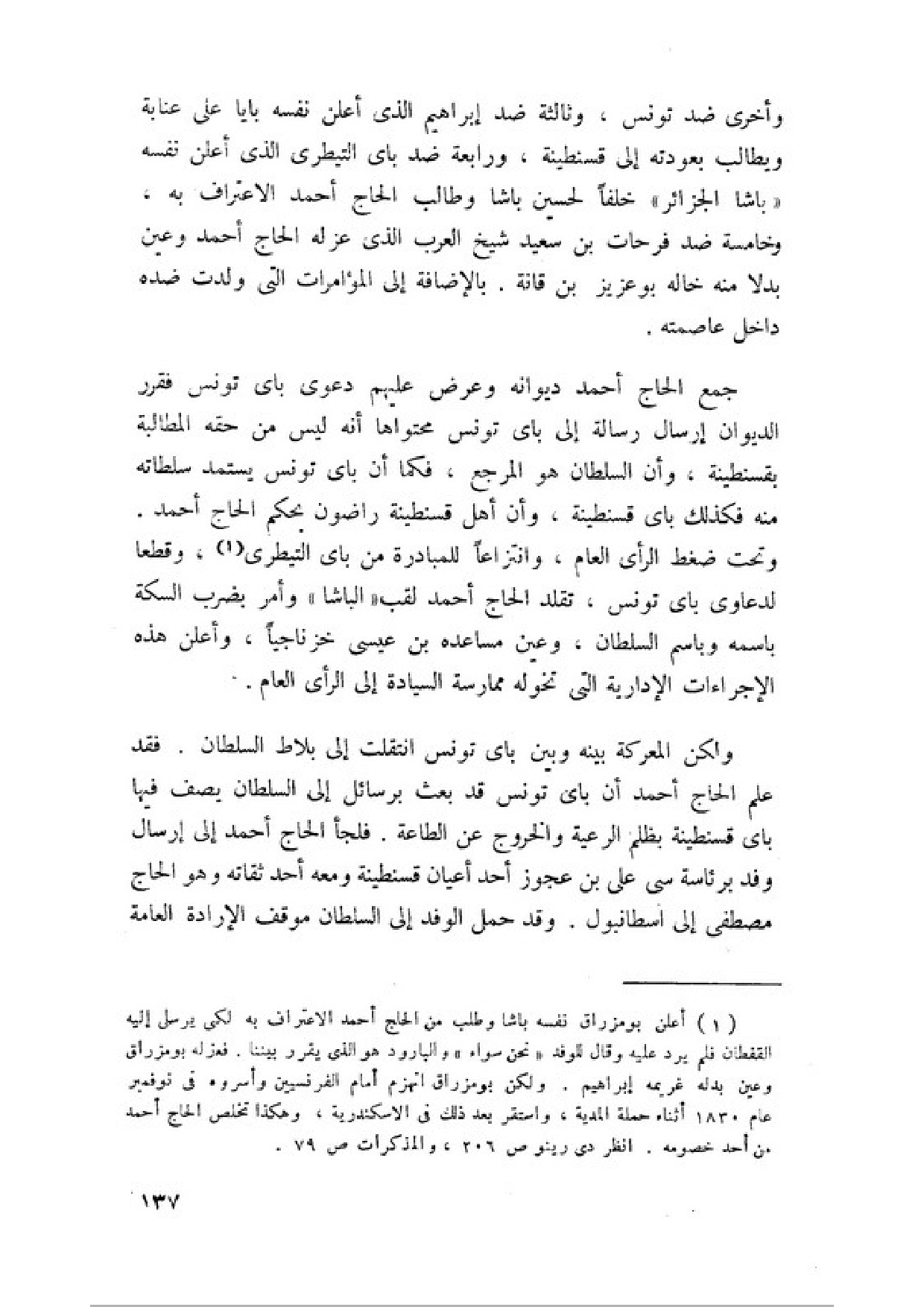 (¬1) أعلن بومزراق نفسه باشا وطلب من الحاج أخمد الاعتراف به لكي يرسل إليه القفطان فلم يرد عليه وقال للوفد (نحن سواء) والبارود هو الذي يقرر بيننا. فعزله بومزراق وعين بدله غريمه إبراهيم. ولكن بومزراق انهزم امام الفرنسيين أسروه في نوفمبر عام 1830 أثناء حملة المدية، واستقر بعد ذلك في الاسكندرية، وهكذا تخلص الحاج أحمد من أحد خصومه. أنظر دي رينو ص 206، والمذكرات ص 79.