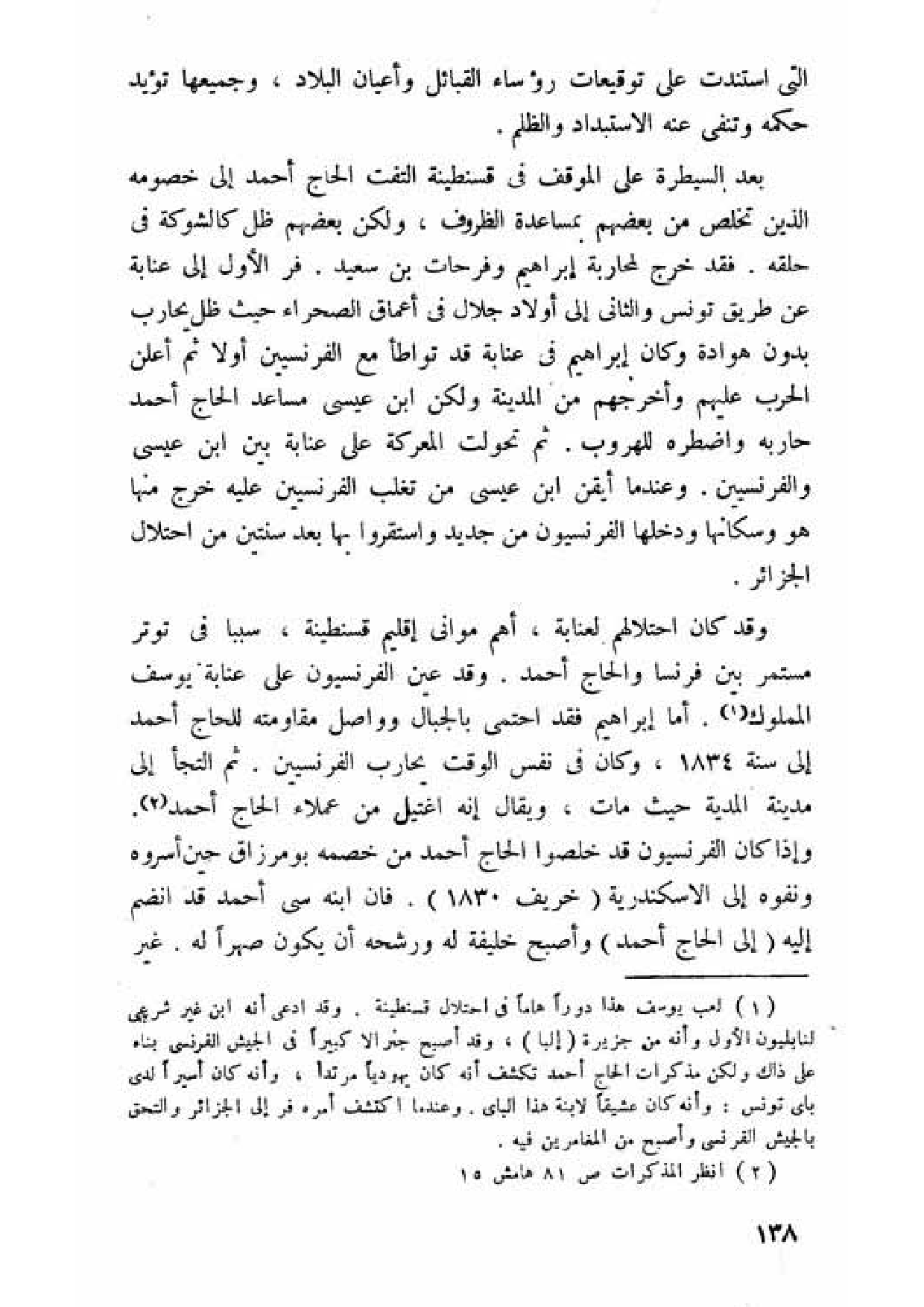 وقد كان احتلالهم لعنابة، أهم مواني إقليم قسنطينة، سببا في توتر مستمر بين فرنسا والحاج أحمد. وقد عين الفرنسيون على عناية يوسف المملوك (¬1). أما إبراهيم فقد احتمى بالجبال وواصل مقاومته للحاج أحمد إلى سنة 1834، وكان في نفس الوقت يحارب الفرنسيين. ثم التجأ إلى مدينة المدية حيث مات، ويقال إنه اغتيل من عملاء الحاج أحمد (¬2). وإذا كان الفرنسيون قد خلصوا الحاج أحمد من خصمه بومرزاق حين أسروه ونفوه إلى الاسكندزية (خريف 1830). فان ابنه سي أحمد قد انضم إليه (إلى الحاج أحمد) وأصبح خليفة له ورشحه أن يكون صهرا له. غير