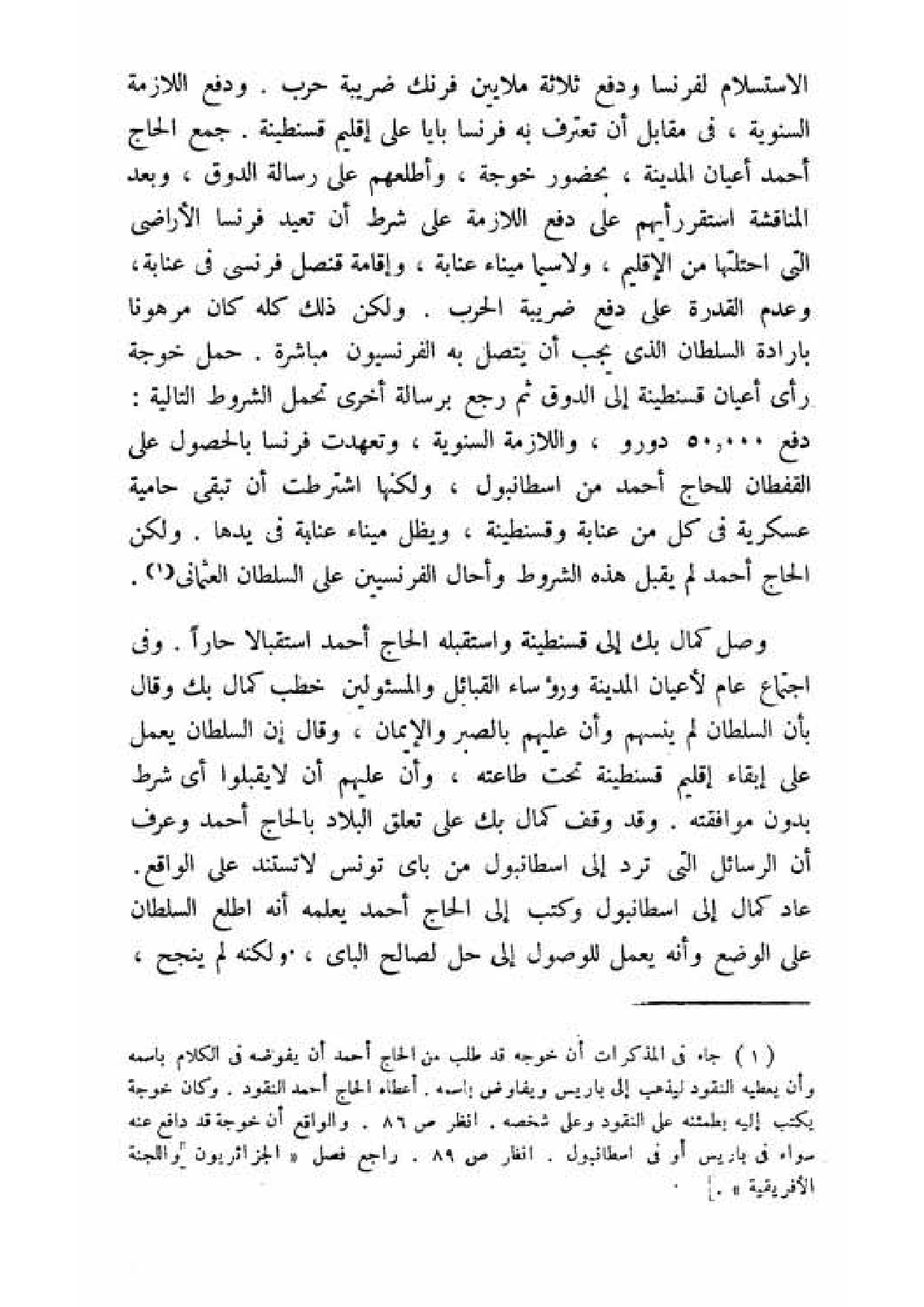 الاستسلام لفرنسا ودفع ثلاثة ملايين فرنك ضريبة حرب. ودفع اللازمة السنوية، في مقابل أن تعترف به فرنسا بايا على إقليم قسنطينة. جمع الحاج أحمد أعيان المدينة، بحضور خوجة، وأطلعهم على رسالة الدوق، وبعد المنافثة استقر رأيهم على دفع اللازمة على شرط أن تعيد فرنسا الأراضي التي احتلتها من الإقليم، ولا سيما ميناء عنابة، وإقامة قنصل فرنسي في عنابة، وعدم القدرة على دفع ضريبة الحرب. ولكن ذلك كله كان مرهونا بارادة السلطان الذي يجب أن يتصل به الفرنسيون مباشرة. حمل خوجة رأي أعيان قسنطينة إلى الدوق ثم رجع برسالة أخرى تحمل الشروط التالية: دفع 50،000 دورو، واللازمة السنوية، وتعهدت فرنسا بالحصول على القفطان للحاج أحمد من اسطانبول، ولكنها اشترطت أن تبقى حامية عسكرية في كل من عنابة وقسنطينة، ويظل ميناء عنابة في يدها. ولكن الحاج أحمد لم يقبل هذه الشروط وأحال الفرنسيين على السلطان العثماني (¬1). وصل كمال بك إلى قسنطينة واستقبله الحاج أحمد استقبالا حارا. وفي اجتماع عام لأعيان المدينة ورؤساء القبائل والمسئولين خطب كمال بك وقال بأن السلطان لم ينسهم وأن عليهم بالصبر والإيمان، وقال إن السلطان يعمل على إبقاء إقليم قسنطينة تحت طاعته، وأن عليهم أن لا يقبلوا أي شرط بدون موافقته. وقد وقف كمال بك على تعلق البلاد بالحاج أحمد وعرف أن الرسائل التي ترد إلى اسطانبول من باي تونس لا تستند على الواقع. عاد كمال إلى اسطانبول وكتب إلى الحاج أحمد يعلمه أنه اطلع السلطان على الوضع وأنه يعمل للوصول إلى حل لصالح الباي، ولكنه لم ينجح،