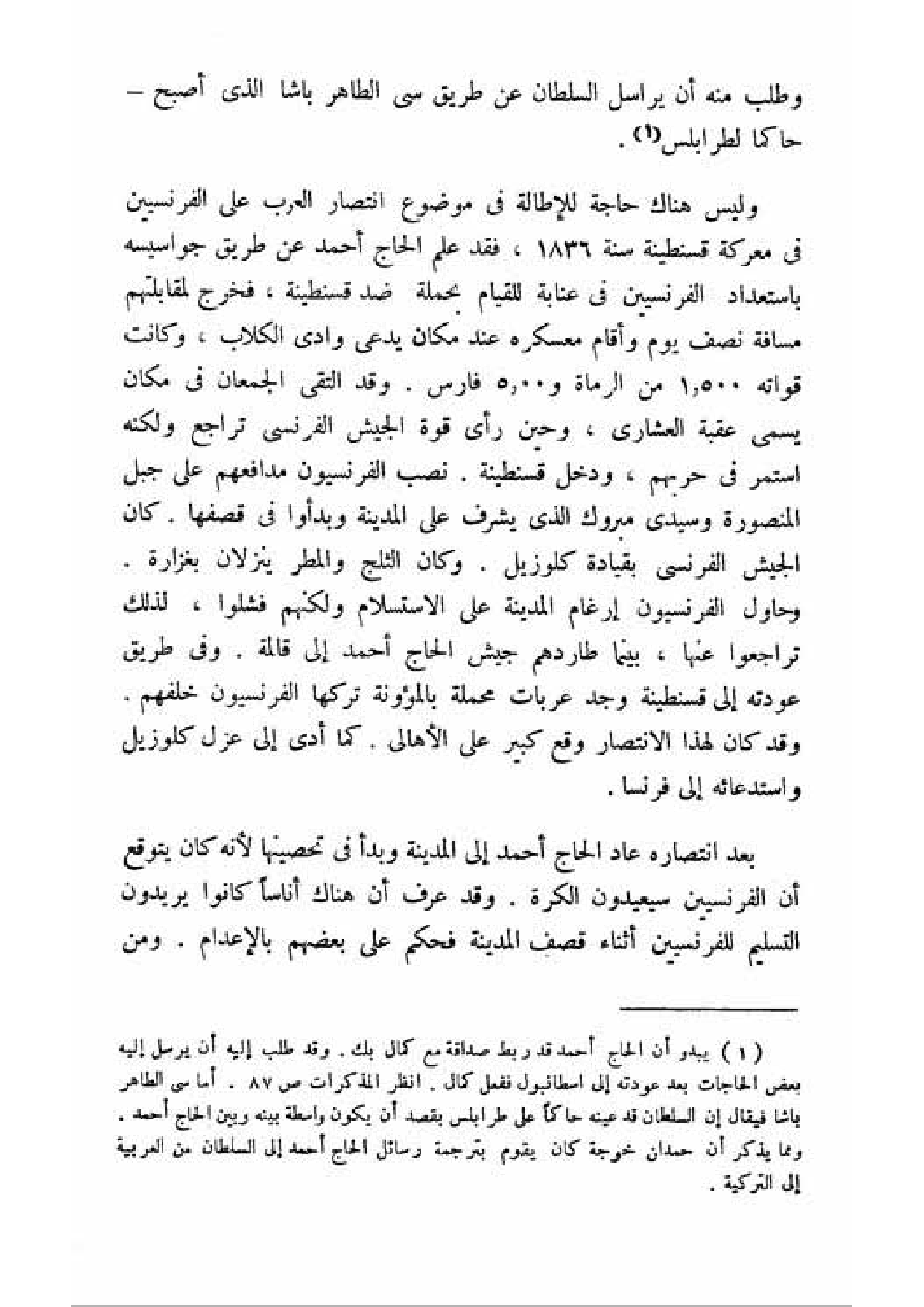 (¬1) يبدو أن الحاج أحمد قد ربط صداقه مع كمال بك. وقد طلب إليه أن يرسل إليه بعض الحاجات بعد عودته إلى اسطانبول ففعل كمال. انظر المذكرات ص 87. أما سي الطاهر باشا فيقال إن السلطان قد عينه حاكما على طرابلس يقصد أن يكون واسطة بينه وبين الحاج أحمد. ومما يذكر أن حمدان خوجة كان يقوم بترجمة رسائل الحاج أحمد إلى السلطان من العربية إلى التركية.