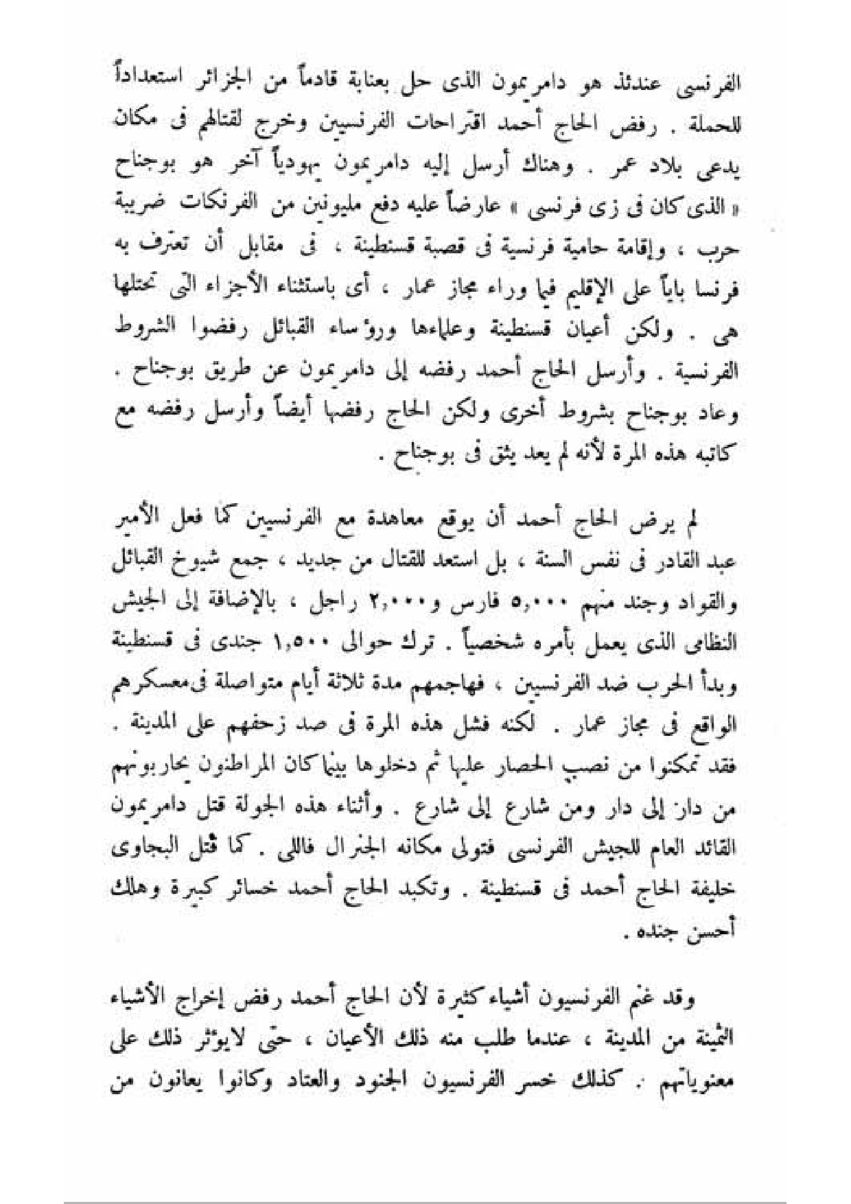 الفرنسي عندئذ م داريمون الذي حل بعنابة قادما من الجزائر استعدادا للحملة. رفض الحاج أحمد اقتراحات الفرنسيين وخرج لقتالهم في مكان يدعى بلاد عمر. وهناك أرسل إليه دامريمون يهوديا آخر هو بوجناح (الذي كان في زي فرنسي) عارضا عليه دفع مليونين من الفرنكات ضريبة حرب , وإقامة حامية فرنسية في قصبة قسنطينة، في مقابل أن تعترف به فرنسا بايا على الإقليم فيما وراء مجاز عمار، أي باستثناء الأجزاء التي تحتلها هي. ولكن أعيان قسنطينة ورؤساء القبائل رفضوا الشروط الفرنسية. وأرسل الحاج أحمد رفضه إلى دامريمون عن طريق بوجناح.