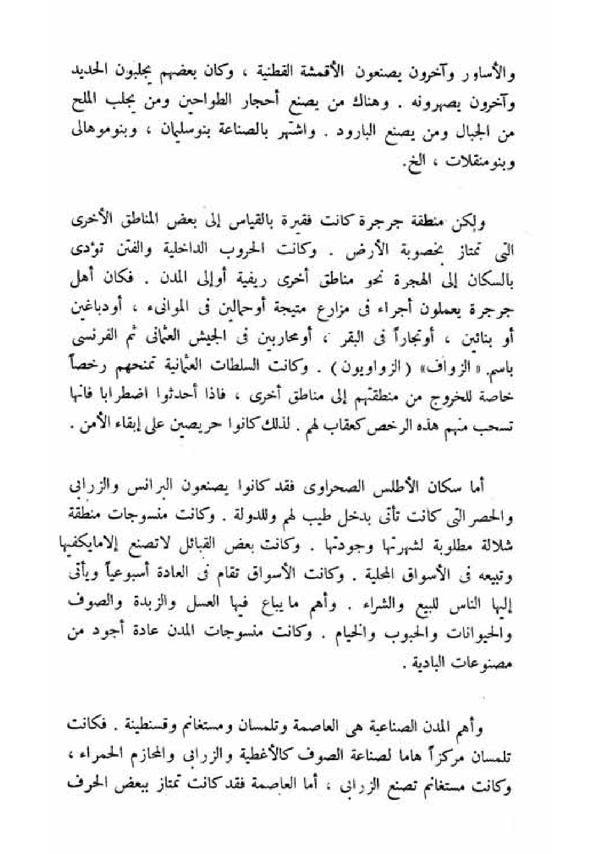 أما سكان الأطلس الصحراوي فقد كانوا يصنعون البرانس والزرابى والحصر التي كانت تأتي بدخل طيب لهم وللدولة. وكانت منسوجات منطقة شلالة مطلوبة لشهرتها وجودتها. وكانت بعض القبائل لا تصنع إلا ما يكفيها وتبيعه في الأسواق المحلية. وكانت الأسواق تقام في العادة أسبوعيا ويأتي إليها الناس للبيع والشراء. وأهم ما يباع فيها العسل والزبدة والصوف والحيوانات والحبوب والخيام. وكانت منسوجات المدن عادة أجود من مصنوعات البادية.