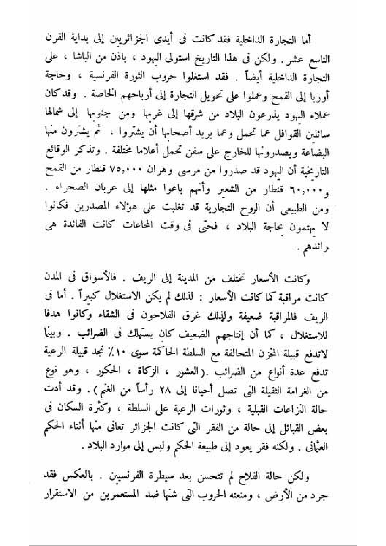 أما التجارة الداخلية فقد كانت في أيدي الجزائريين إلى بداية القرن التاسع عشر. ولكن في هذا التاريخ استولى اليهود، بإذن من الباشا، على التجارة الداخلية أيضا. فقد استغلوا حروب الثورة الفرنسية، وحاجة أوربا إلى القمح وعملوا على تحويل التجارة إلى أرباحهم الخاصة. وقد كان عملاء اليهود يذرعون البلاد من شرقها إلى غربها ومن جنوبها إلى شمالها سائلين القوافل عما تحمل وعما يريد أصحابها أن يشتروا، ثم يشترون منها البضاعة ويصدرونها للخارج على سفن تحمل أعلاما مختلفة. وتذكر الوقائع التاريخية أن اليهود قد صدروا من مرسى وهران 75،000 قنطار من القمح و 60،000 قنطار من الشعير وأنهم باعوا مثلها إلى عربان الصحراء.