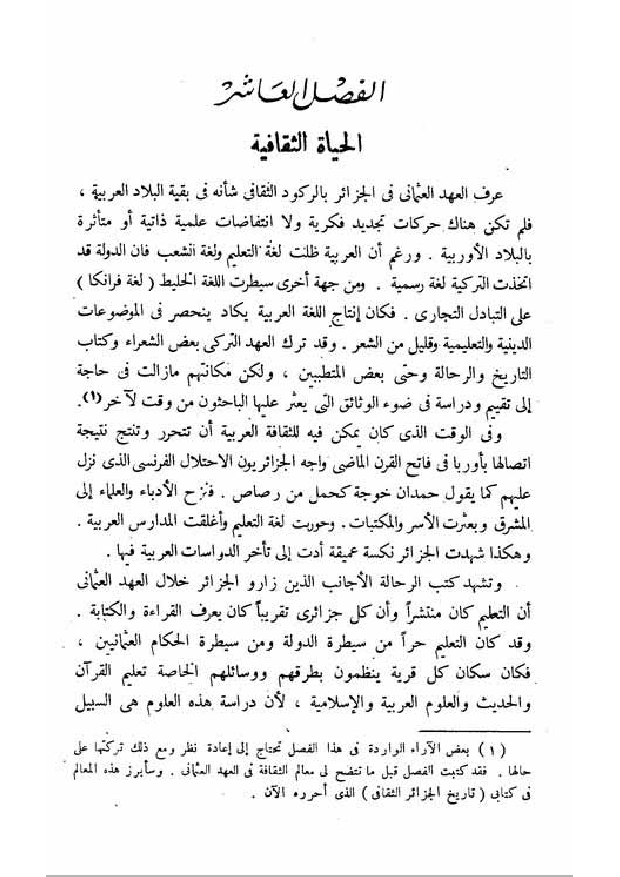 (¬1) بعض الآراء الواردة في هذا الفصل تحتاج إلى إعادة نظر ومع ذلك تركتها على حالها. فقد كتبت الفصل قبل ما تتضح لي معالم الثقافة في العهد العثماني. وسأبز هذه المعالم في كتابي (تاريخ الجزائر الثقافي) الذي أحرره الآن.