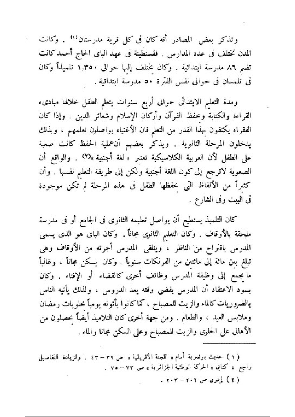 ومدة التعليم الابتدائي حولي أربع سنوات يتعلم الطفل خلالها مبادىء القراءة والكتابة ويحفظ القرآن وأركان الإسلام وشعائر الدين. وإذا كان الفقراء يكتفون بهذا القدر من التعلم فان الأغنياء يواصلون تعلمهم. وبذلك يدخلون المرحلة الثانوية. ويذكر بعضهم أن عملية الحفظ كانت صعبة على الطفل لأن العربية الكلاسيكية تعتبر (لغة أجنبية، (¬2). والواقع أن الصعوبة لا ترجع إلى كون اللغة أجنبية ولكن إلى طريقة التعلم نفسها. وأن كثيرا من الألفاظ التي يحفظها الطفل في هذه المرحلة لم تكن موجودة في البيت وفي الشارع.