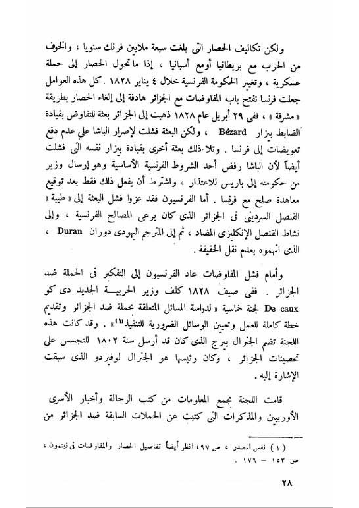 ولكن تكاليف الحصار التي بلغت سبعة ملايين فرنك سنويا، والخوف من الحرب مع بريطانيا أو مع أسبانيا، إذا ما تحول الحصار إلى حملة عسكرية، وتغيير الحكومة الفرنسية خلال 4 يناير 1828.كل هذه العوامل جعلت فرنسا تفتح باب المفاوضات مع الجزائر هادفة إلى إلغاء الحصار بطريقة (مشرفة)، ففي 29 أبريل عام 1828 ذهبت إلى الجزائر بعثة للتفاوض بقيادة الضابط بيزار Bézard، ولكن البعثة فشلت لإصرار الباشا على عدم دفع تعويضات إلى فرنسا. وتلا ذلك بعثة أخرى بقيادة بيزار نفسه التي فشلت أيضا لأن الباشا رفض أحد الشروط الفرنسية الأساسية وهو إرسال وزير من حكومته إلى باريس للاعتذار، واشترط أن يفعل ذلك فقط بعد توقيع معاهدة صلح مع فرنسا. أما الفرنسيون فقد عزوا فشل البعثة إلى (طيبة) القنصل السرديني في الجزائر الذي كان يرعى المصالح الفرنسية، وإلى نشاط القنصل الإنكليزي المضاد، ثم إلى المترجم اليهودي دوران Duran ، الذي اتهموم بعدم نقل الحقيقة.