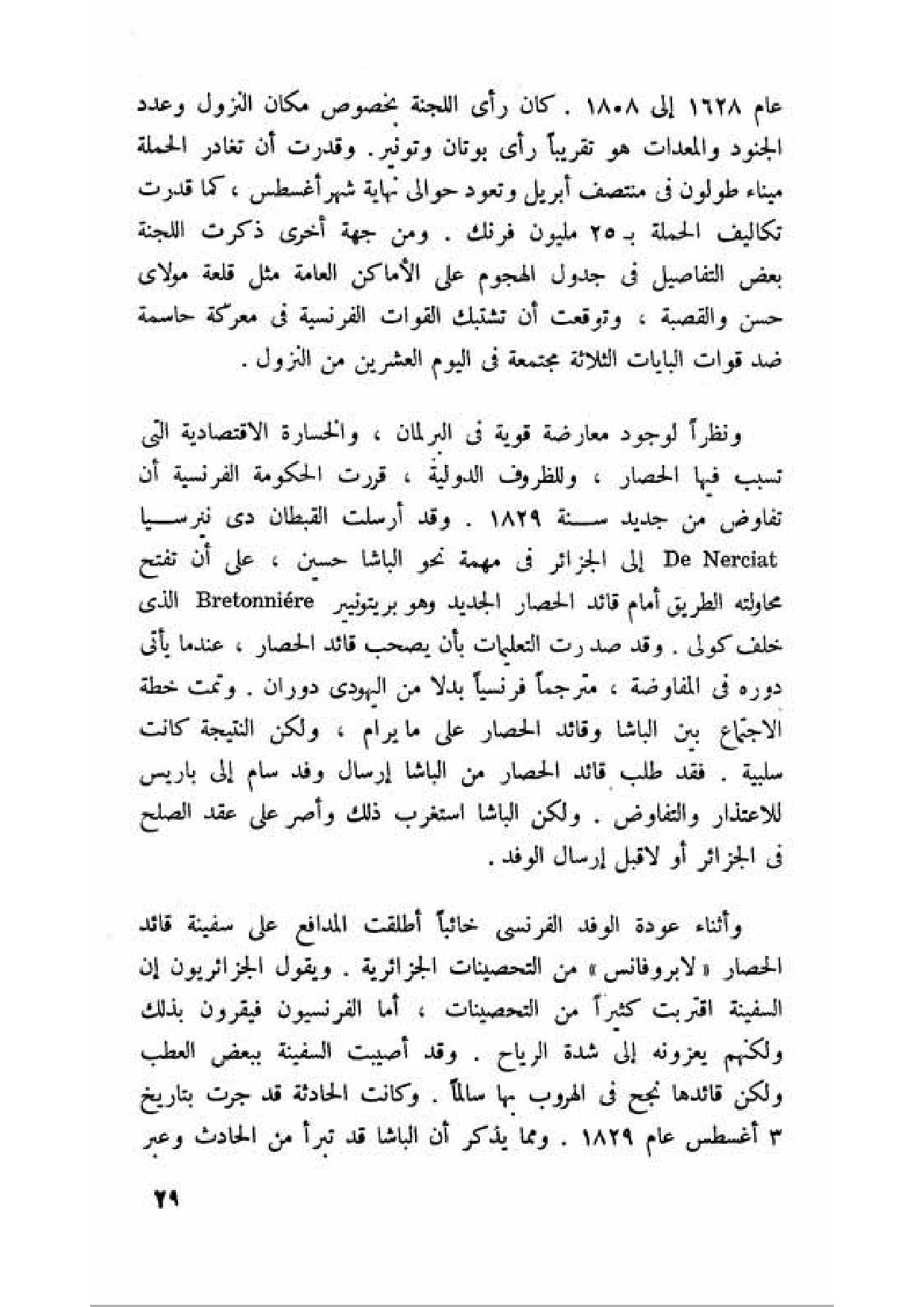 ونظرا لوجود معارضة قوية في البرلمان، والخسارة الاقتصادية التي تسبب فيها الحصار، وللظروف الدولية، قررت الحكومة الفرنسية أن تفاوض من جديد سنة 1829. وقد أرسلت القبطان دى نيرسيا De Nerciat إلى الجزائر في مهمة نحو الباشا حسين، على أن تفتح محاولته الطريق أمام قائد الحصار الجديد وهو بريتونيير Bretonnière الذي خلف كولى. وقد صدرت التعليمات بأن يصحب قائد الحصار، عندما يأتي دوره في المفاوضة، مترجما فرنسيا بدلا من اليهوي دوران. وتمت خطة الاجتماع بين الباشا وقائد الحصار على ما يرام، ولكن النتيجة كانت سلبية. فقد طلب قائد الحصار من الباشا إرسال وفد سام إلى باريس للاعتذار والتقارض. ولكن الباشا استغرب ذلك وأصر على عقد الصلح في الجزائر أو لا يقبل إرسال الوفد.