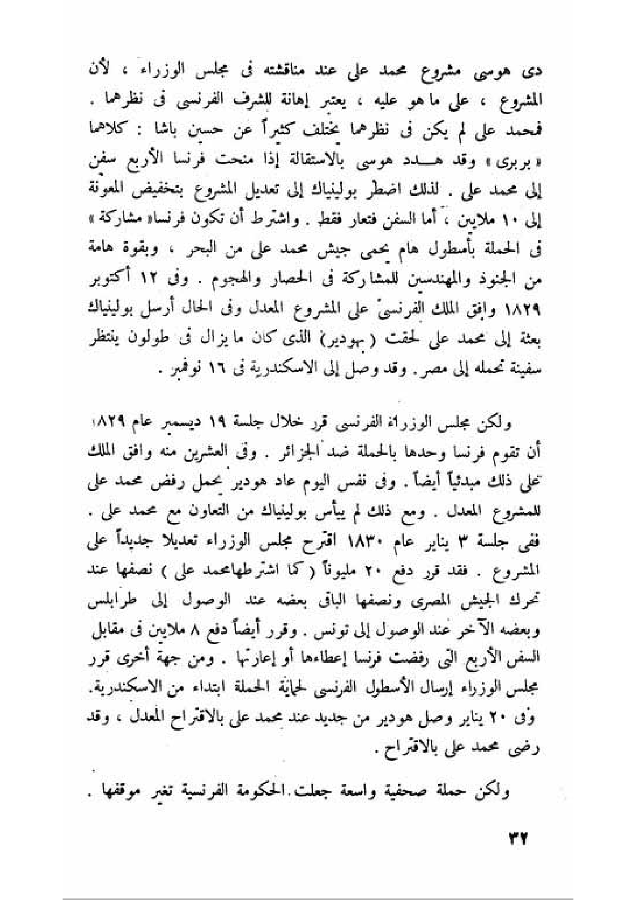 فمحمد علي لم يكن في نظرهما يختلف كثيرا عن حسين باشا: كلاهما (بربري) وقد هدد هوسي بالاستقالة إذا منحت فرنسا الأربع سفن إلى محمد علي. لذلك اضطر بولينياك إلى تعديل المشروع بتخفيض المعونة إلى 10 ملايين، أما السفن فتعار فقط. واشترط أن تكون فرنسا (مشاركة) في الحملة بأسطول هام يحمي جيش محمد علي من البحر، وبقوة هامة من الجنود والمهندسين للمشاركة في الحصار والهجوم. وفي 12 أكتوبر 1829 وافق الملك الفرنسي على المشروع المعدل وفي الحال أرسل بولينياك بعثة إلى محمد علي لحقت (يهودير) الذي كان ما يزال في طولون ينتظر سفينة تحمله إلى مصر. وقد وصل إلى الاسكندرية في 16 نوفمبر.