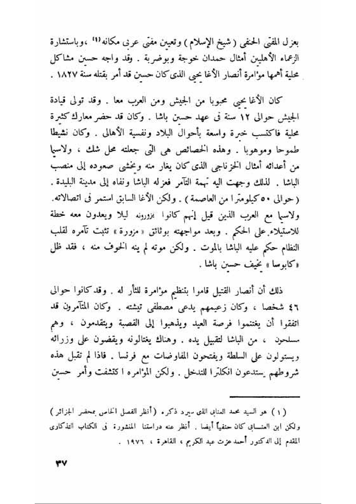 ذلك أن أنصار القتيل قاموا بتنظيم مؤامرة للثأر له. وقد كانوا حوالي 46 شخصا، وكان زعيمهم يدعى مصطفى تيشته. وكان المتآمرون قد اتفقوا أن يغتنموا فرصة العيد ويذهبوا إلى القصبة ويتقدمون، وهم مسلحون، من الباشا لتقبيل يده. وهناك يغتالونه ويقضون على وزرائه ويستولون على السلطة ويفتحون المفاوضات مع فرنسا. فإذا لم تقبل هذه شروطهم يستدعون انكلترا للتدخل. ولكن المؤامرة اكتشفت وأمر حسين (¬1) هو السيد محمد العنابي الذي سيرد ذكره (أنظر الفصل الخاص بمحضر الجزائر) ولكن ابن العنابي كان حنفيا أيضا. أنظر عنه دراستنا المنشورة في الكتاب التذكاري المقدم إلى الدكتور أحمد عزت عبد الكريم، القاهرة، 1976.