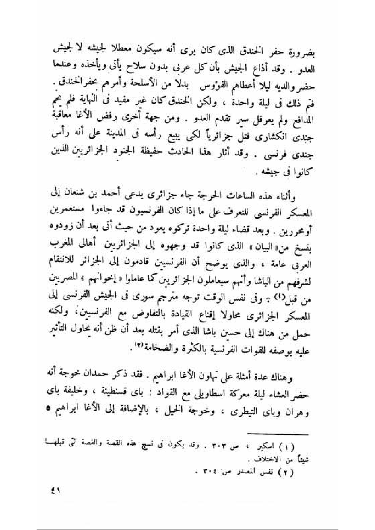 وأثناء هذه الساعات الحرجة جاء جزائري يدعى أحمد بن شنعان إلى المعسكر الفرنسي للتعرف على ما إذا كان الفرنسيون قد جاءوا مستعمرين أو محررين. وبعد قضاء ليلة واحدة تركوه يعود من حيث أتى بعد أن زودوه بنسخ من (البيان) الذي كانوا قد وجهوه إلى الجزائريين أهالي المغرب العرب عامة، والذي يوضح أن الفرنسيين قادمون إلى الجزائر للانتقام لشرفهم من الباشا وأنهم سيعاملون الجزائريين كما عاملوا (إخوانهم) المصريين من قبل (¬1). وفي نفس الوقت توجه مترجم سوري في الجيش الفرنسي إلى المعسكر الجزائري محاولا إقناع القيادة بالتفاوض مع الفرنسيين، ولكنه حمل من هناك إلى حسين باشا الذي أمر بقتله بعد أن ظن أنه يحاول التأثير عليه بوصفه للقوات الفرنسية بالكثرة والضخامة (¬2).