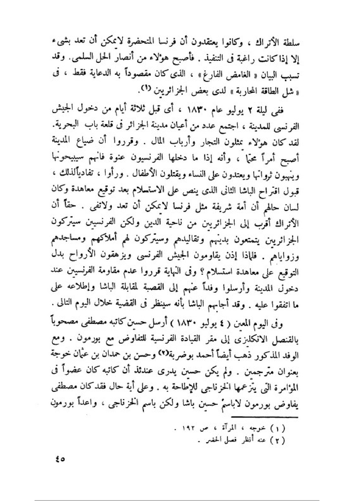 وفي اليوم المعين (4 يوليو 1830) أرسل حسين كاتبه مصطفى مصحوبا بالقنصل الانكليزي إلى مقر القيادة الفرنسية للتفاوض مع بورمون. ومع الوفد المذكور ذهب أيضا أحمد بوضربة (¬2)، وحسن بن حمدان بن عثمان خوجة بعنوان مترجمين. ولم يكن حسين يدري عندئذ أن كاتبه كان عضوا في المؤامرة التي يتزعمها الخزناجي للإطاحة به. وعلى أية حال فقد كان مصطفى يفاوض بورمون لا باسم حسين باشا ولكن باسم الخزناجي، واعدا بورمون