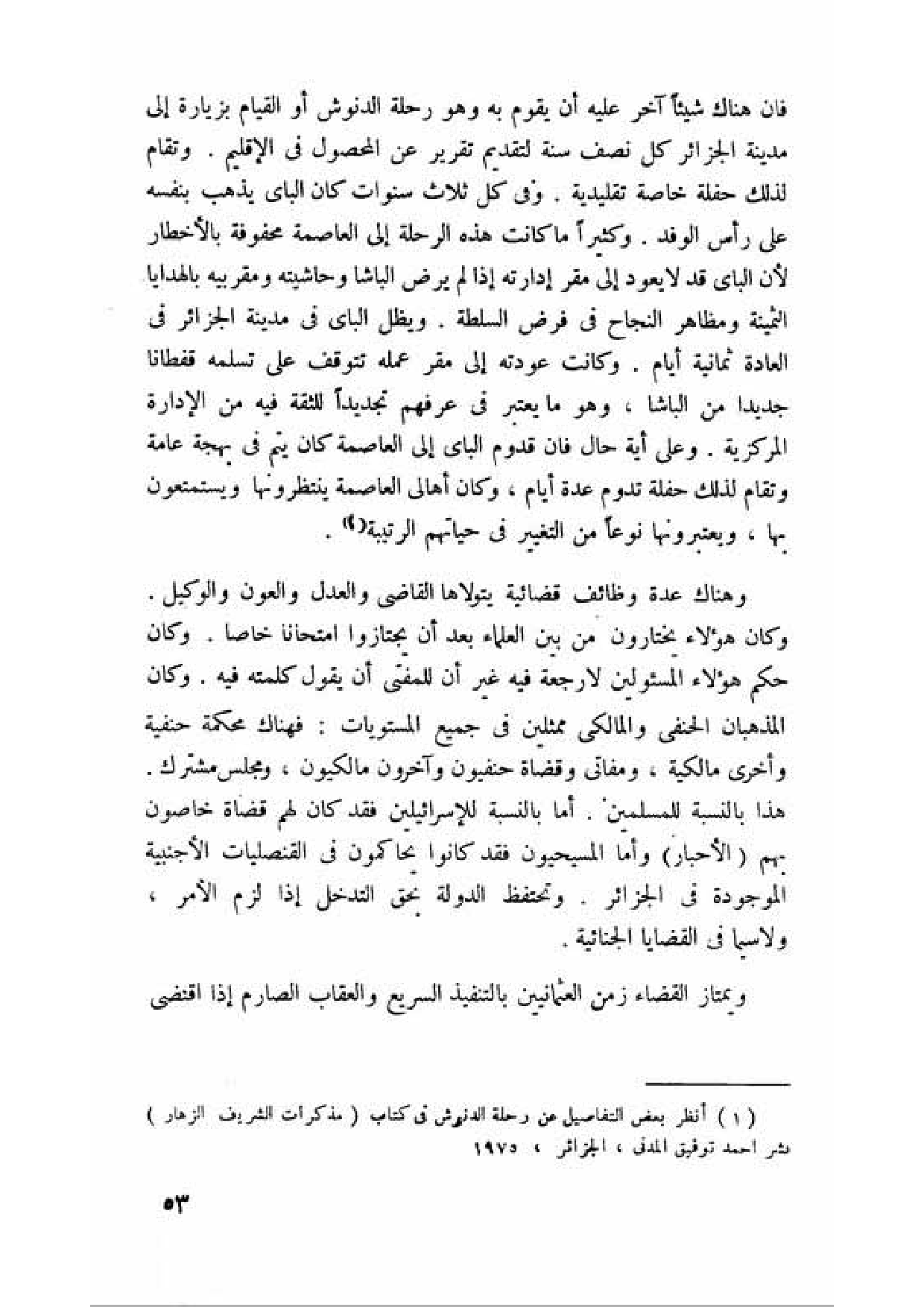 فان هناك شيئا آخر عليه أن يقوم به وهو رحلة الدنوش أو القيام بزيارة إلى مدينة الجزائر كل نصف سنة لتقديم تقرير عن المحصول في الإقليم. وتقام لذلك حفلة خاصة تقليدية. وفي كل ثلاث سنوات كان الباي يذهب بنفسه على رأس الوفد. وكثيرا ما كانت هذه الرحلة إلى العاصمة محفوفة بالأخطار لأن الباي قد لا يعود إلى مقر إدارته إذا لم يرض الباشا وحاشيته ومقربيه بالهدايا الثمينة ومظاهر النجاح في فرض السلطة. ويظل الباي في مدينة الجزائر في العادة ثمانية أيام. وكانت عودته إلى مقر عمله تتوقف على تسلمه قفطانا جديدا من الباشا، وهو ما يعتبر في عرفهم تجديدا للثقة فيه من الإدارة المركزية. وعلى أية حال فان قدوم الباي إلى العاصمة كان يتم في بهجة عامة وتقام لذلك حفلة تدوم عدة أيام، وكان أهالي العاصمة ينتظرونها ويستمتعون بها، ويعتبرونها نوعا من التغيير في حياتهم الرتيبة (¬1).