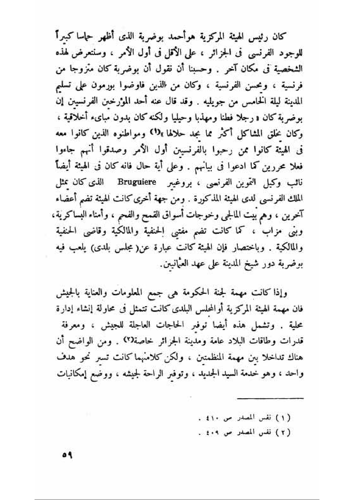 كان رئيس الهيئة المركزية هو أحمد بوضربة الذي أظهر حماسا كبيرا للوجود الفرنسي في الجزائر، على الأقل في أول الأمر، وسنتعرض لهذه الشخصية في مكان آخر. وحسبنا أن نقول أن بوضربة كان متزوجا من فرنسية، ويحسن الفرنسية، وكان من الذين فاوضوا بورمون على تسليم المدينة ليلة الخامس من جويليه. وقد قال عنه أحد المورخين الفرنسيين إن بوضربة كان (رجلا فطنا ومهذبا وحيليا ولكنه كان بدون مبادىء أخلاقية، وكان يخلق المشاكل أكثر مما يجد حلالها (¬1) ومواطنوه الذين كانوا معه في الهيئة كانوا ممن رحبوا بالفرنسيين أول الأمر وصدقوا أنهم جاءوا فعلا محررين كما ادعوا في بيانهم. وعلى أية حال فانه كان في الهيئة أيضا نائب وكيل التموين الفرنسي، بروغير Bruguiere الذي كان يمثل الملك الفرنسي لدى الهيئة المذكورة. ومن جهة أخرى كانت الهيئة تضم أعضاء آخرين، وهم بيت المالجي وخوجات أسواق القمح والفحم، وأمناء البساكرية، وبني مزاب، كما كانت تضم مفتي الحنفية والمالكية وقاضي الحنفية والمالكية. وباختصار فإن الهيئة كانت عبارة عن (مجلس بلدي) يلعب فيه بوضربة دور شيخ المدينة على عهد العثمانيين.