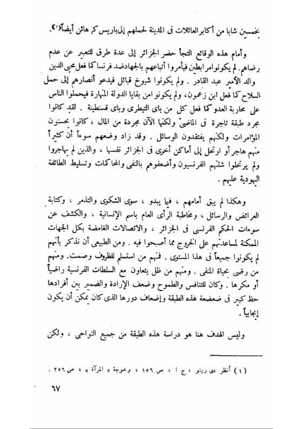 وهكذا لم يبق أمامهم، فيما يبدو، سوى الشكوى والتذمر، وكتابة العرائض والرسائل، ومخاطبة الرأي العام باسم الإنسانية. والكشف عن سوءات الحكم الفرنسي في الجزائر، والاتصالات الغامضة بكل الجهات الممكنة لمساعدتهم على الخروج مما أصبحوا فيه، ومن الطبيعي أن نذكر بأنهم لم يكونوا جميعا في هذا المستوى. فمنهم من استسلم للظروف وصمت. ومنهم من رضي بحياة المنفى. ومنهم من ظل يتعاون مع السلطات القرنسية راضيا أو مكرها. وكان للتنافس والطموح وضعف الإرادة والضمير بين أفرادها حظ كبير في ضعضعة هذه الطبقة وإضعاف دورها الذي كان يمكن أن يكون إيجابيا.
