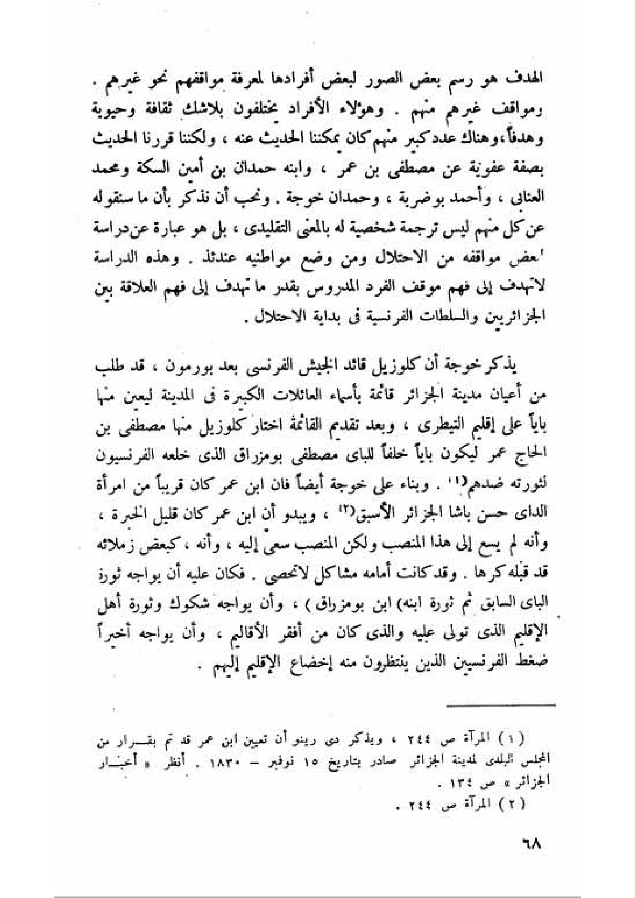 الهدف هو رسم بعض الصور لبعض أفرادها لمعرفة مواقفهم نحو غيرهم، ومواقف غيرهم منهم. وهؤلاء الأفراد يختلفون بلا شك ثقافة وحيوية وهدفا، وهناك عدد كبير منهم كان يمكننا الحديث عنه، ولكننا قررنا الحديث بصفة عفوية عن مصطفى بن عمر، وابنه حمدان بن أمين السكة ومحمد العنابي، وأحمد بوضربة، وحمدان خوجة. ونحب أن نذكر بأن ما سنقوله عن كل منهم ليس ترجمة شخصية له بالمعنى التقليدي، بل هو عبارة عن دراسة لبعض مواقفه من الاحتلال ومن وضع مواطنيه عندئذ. وهذه الدراسة لا تهدف إلى فهم موقف الفرد المدروس بقدر ما تهدف إلى فهم العلاقة بين الجزائريين والسلطات الفرنسية في بداية الاحتلال.