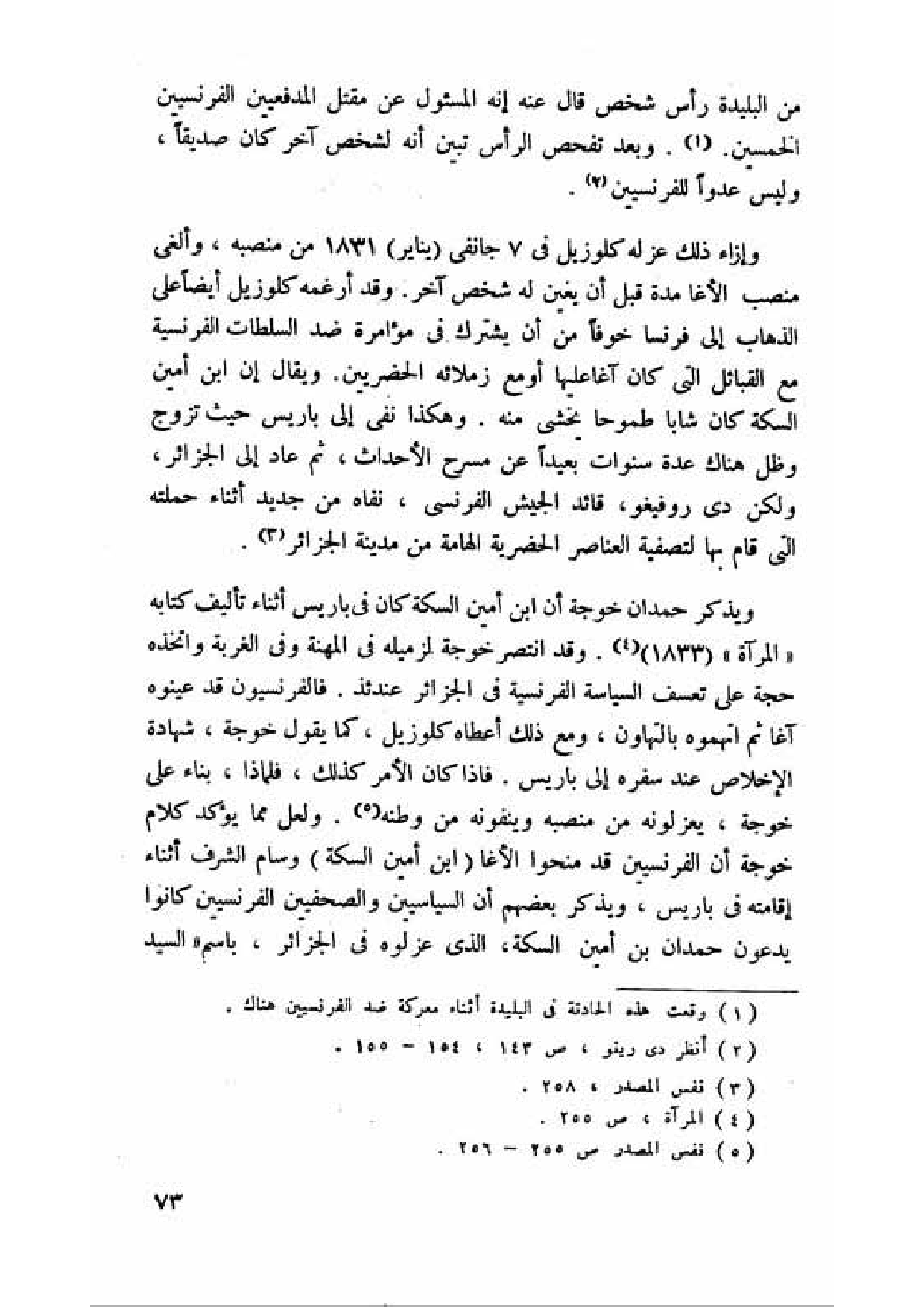 ويذكر حمدان خوجة أن ابن أمين السكة كان في باريس أثناء تأليف كتابه (المرآة) (1833) (¬4). وقد انتصر خوجة لزميله في المهنة وفي الغربة واتخذه حجة على تعسف السياسة الفرنسية في الجزائر عندئذ. فالفرنسيون قد عينوه آغا ثم اتهموه بالتهاون، ومع ذلك أعطاه كلوزيل، كما يقول خوجة، شهادة الإخلاص عند سفره إلى باريس، فاذا كان الأمر كذلك، فلماذا، بناء على خوجة، يعزلونه من منصبه وينفونه من وطنه (¬5). ولعل مما يؤكدكلام خوجة أن الفرنسيين قد منحوا الأغا (ابن أمين السكة) وسام لشرف أثناء إقامته في باريس، ويذكر بعضهم أن السياسيين والصحفيين الفرنسيين كانوا يدعون حمدان بن أمين السكة، الذي عزلوه في الجزائر، باسم السيد